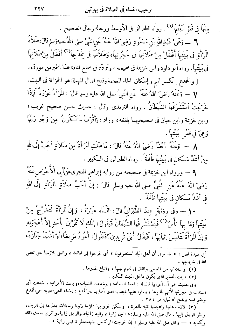 6 - عن عبد الله بن مسعودٍ رضي الله عنه عن النبى صلى الله عليه وسلم قال: صلاة المرأة في بيتها أفضل من صلاتها في حجرتها، وصلاتها في مخدعها (¬2) أفضل من صلاتها في بيتها. رواه أبو داود وابن خزيمة في صحيحه، وتردّد في سماع قتادة هذا الخبر من مورق.