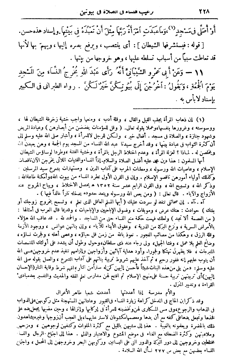 (¬1) إن ذهاب المرأة يجلب القيل والقال، وقلة أدب، ومنعها واجب خشية زخرفة الشيطان لها، ووسوسته، وغرورها بنفسها، وعملا بقوله تعالى: (وقل للمؤمنات يغضضن من أبصارهن) وعيادة المريض وشهود جنازة، والصلاة في مسجد. أفعال خير، ولكن للرجل لا للمرأة، وأشار صلى الله عليه وسلم إلى أن كثرة الثواب في عبادة بيتها، وقد أخرج سيدنا عبد الله النساء من المسجد يوم الجمعة، وهن يعبدن الله ويخلصن له. لماذا؟ لعزلة المرأة، وعدم اختلاط الرجل بالمرأة، وخشية الفتنة، وطردا لوساوس الشيطان.