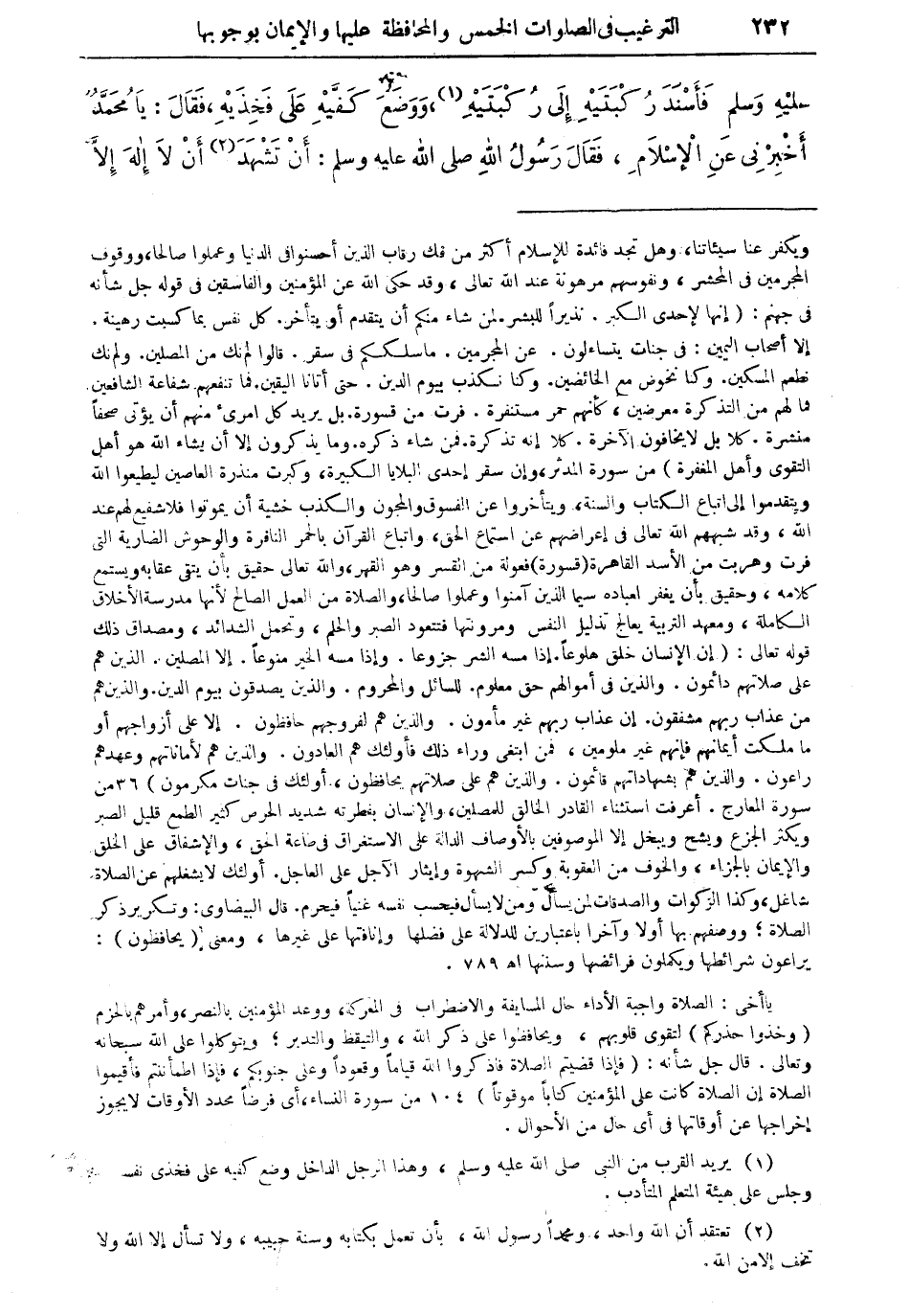 = ويكفر عنا سيئاتنا، وهل تجد فائدة للإسلام أكثر من فك رقاب الذين أحسنوا في الدنيا وعملوا صالحا، ووقوف المجرمين في المحشر، ونفوسهم مرهونة عند الله تعالى، وقد حكى الله عن المؤمنين والفاسقين في قوله جل شأنه في جهنم: (إنها لإحدى الكبر. نذيراً للبشر لمن شاء منكم أن يتقدم أو يتأخر. كل نفس بما كسبت رهينة. إلا أصحاب اليمين: في جنات يتساءلون. عن المجرمين. ما سلككم في سقر. قالوا لم نك من المصلين. ولم نك نطعم المسكين. وكنا نخوض مع الخائضين. وكنا نكذب بيوم الدين. حتى أتانا اليقين. فما تنفعهم شافعة الشافعين فما لهم عن التذكرة معرضين، كأنهم حمر مستنفرة. فرت من قسورة. بل يريد كل امرئ منهم أن يؤتى صحفاً منشرة. كلا بل لا يخافون الآخرة. كلا إنه تذكرة. فمن شاء ذكره. وما يذكرون إلا أن يشاء الله هو أهل التقوى وأهل المغفرة) من سورة المدثر، وإن سقر إحدى البلايا الكبيرة، وكبرت منذرة العاصين ليطيعوا الله ويتقدموا إلى اتباع الكتاب والسنة، ويتأخروا عن الفسوق والمجون والكذب خشية أن يموتوا فلا شفيع لهم عند الله، وقد شبههم الله تعالى في إعراضهم عن استماع الحق، واتباع القرآن بالحمر النافرة والوحوش الضارية التى فرت وهربت من الأسد القاهرة (قسورة) فعولة من القسر وهو القهر، والله تعالى حقيق بأن يتقى عقابه ويستمع كلامه، وحقيق بأن يغفر لعباده سيما الذين آمنوا وعملوا صالحا، والصلاة من العمل الصالح لأنها مدرسة الأخلاق الكاملة، ومعهد التربية يعالج تذليل النفس ومرونتها فتتعود الصبر والحلم، وتحمل الشدائد، ومصداق ذلك قوله تعالى: (إن الإنسان خلق هلوعاً. إذا مسه الشر جزوعا. وإذا مسه الخير منوعاً. إلا المصلين. الذين هم على صلاتهم دائمون. والذين في أموالهم حق معلوم. للسائل والمحروم. والذين يصدقون بيوم الدين. والذين هم من عذاب ربهم مشفقون. إن عذاب ربهم غير مأمون. والذين هم لفروجهم حافظون. إلا على أزواجهم أو ما ملكت إيمانهم فإنهم غير ملومين، فمن ابتغى وراء ذلك فأولئك هم العادون. والذين هم لأماناتهم وعهدهم راعون. والذين هم بشهادتهم قائمون. والذين هم على صلاتهم يحافظون، أولئك في جنات مكرمون) 36 من سورة المعارج. أعرفت استثناء القادر الخالق للمصلين، والإنسان بفطرته شديد الحرص كثير الطمع قليل الصبر ويكثر الجزع ويشح ويبخل إلا الموصوفين بالأوصاف الدالة على الاستغراق في طاعة الحق، والإشفاق على الخق والإيمان بالجزاء، والخوف من العقوبة وكسر الشهوة وإيثار الآجل على العاجل. أولئك لا يشغلهم عن الصلاة شاغل، وكذا الزكوات والصدقات لمن يسأل ومن لا يسأل فيحسب نفسه غنياً فيحرم. قال البيضاوى: وتكرير ذكر الصلاة؛ ووصفهم بها أولا وآخرا باعتبارين للدلالة على فضلها وإنافتها على غيرها، ومعنى (يحافظون): يراعون شرائطها ويكملون فرائضها وسننها أهـ 789.