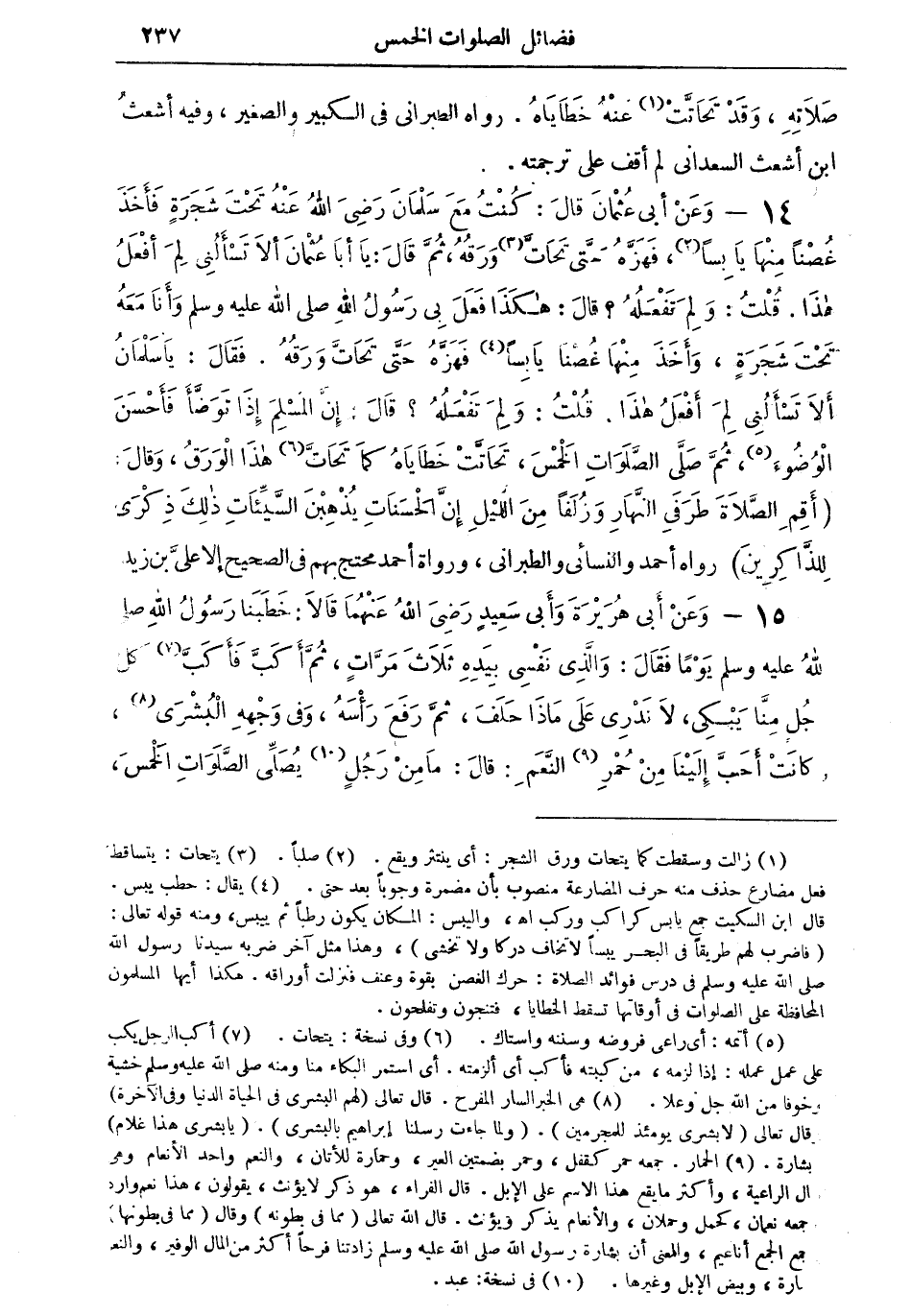 14 - وعن أبي عثمان قال: كنت مع سلمان رضي الله عنه تحت شجرةٍ فأخذ غصناً يابساً (¬2)، فهزَّهُ حتى تحاتَّ (¬3)
