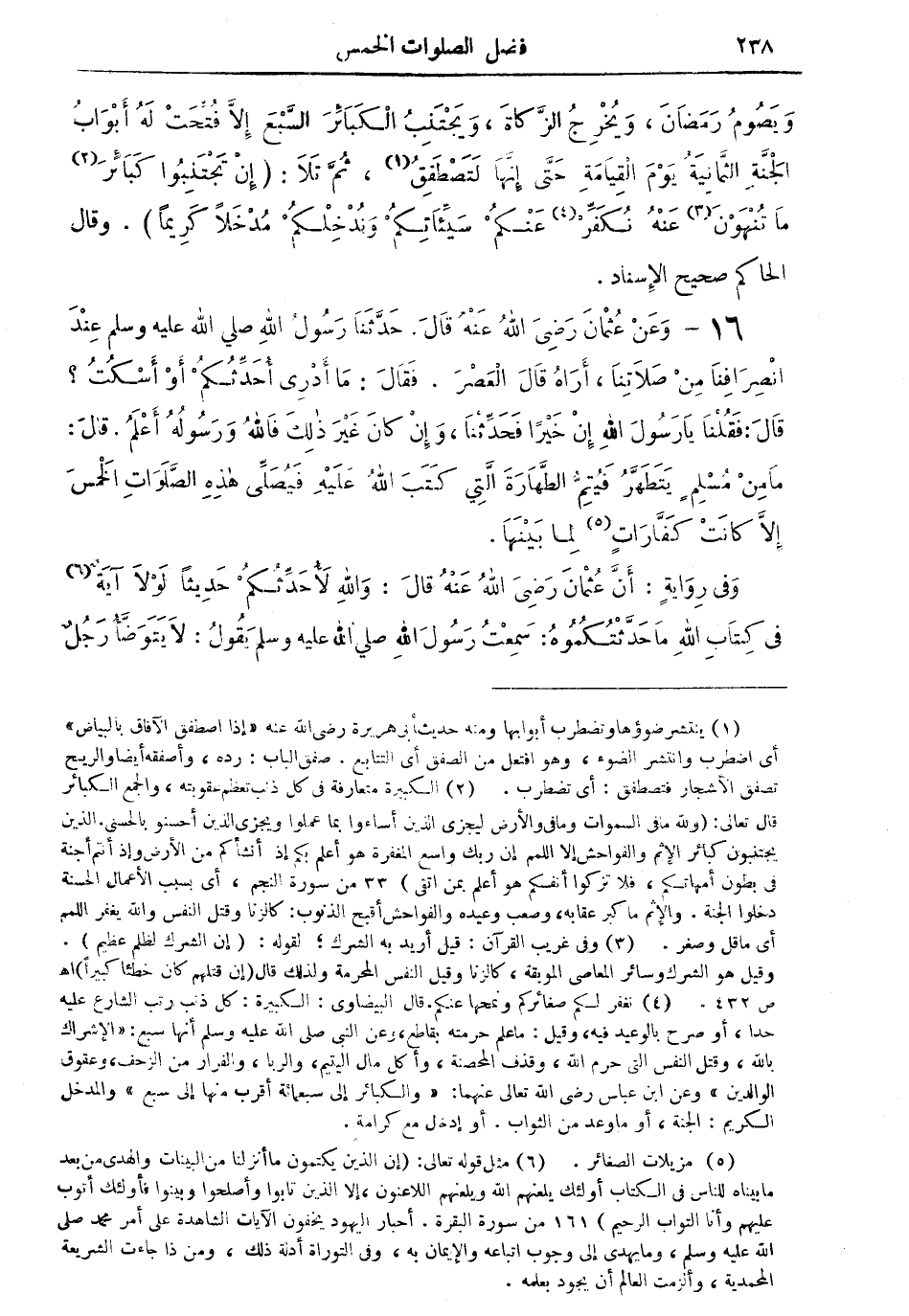 16 - وعن عثمان رضي الله عنه قال: حدثنا رسول الله صلى الله عليه وسلم عند انصرافنا من صلاتنا، أراه قال العصر. فقال: ما أدرى أُحدثكم أو أسكت؟ قال: فقلنا يا رسول الله إن خيراً فحدثنا، وإن كان غير ذلك فالله ورسوله أعلم. قال: ما من مسلمٍ يتطهر فيُتم الطهارة التى كتب الله عليه فيصلى هذه الصلوات الخمس إلا كانت كفاراتٍ (¬5) لما بينها.
