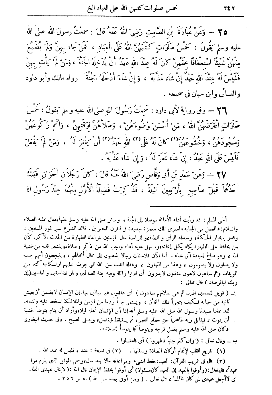 25 - وعن عبادة بن الصامت رضي الله عنه قال: سمعت رسول الله صلى الله عليه وسلم يقول: خمس صلواتٍ كتبهن الله على العباد، فمن جاء بهن ولم يضيع منهن شيئاً استخفافاً بحقهنَّ كان له عند الله عهدٌ أن يدخله الجنة، ومن لم يأتِ بهن فليس له عند الله عهد إن شاء عذبه، وإن شاء أدخله الجنة رواه مالك وأبو داود والنسائي وابن حبان في صحيحه.