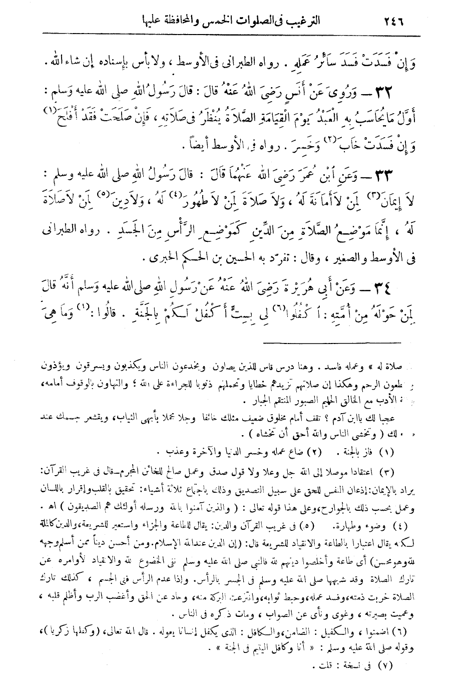 33 - وعن ابن عمر رضي الله عنهما قال: قال رسول الله صلى الله عليه وسلم: لا إيمان (¬3) لمن لا أمانة له، ولا صلاة لمن لا طهور (¬4) له، ولا دين (¬5) لمن لا صلاة له، إنما موضع الصلاة من الدين كموضع الرأس من الجسد. رواه الطبراني في الأوسط والصغير، وقال: تفرّد به الحسين بن الحكم الحبرى.