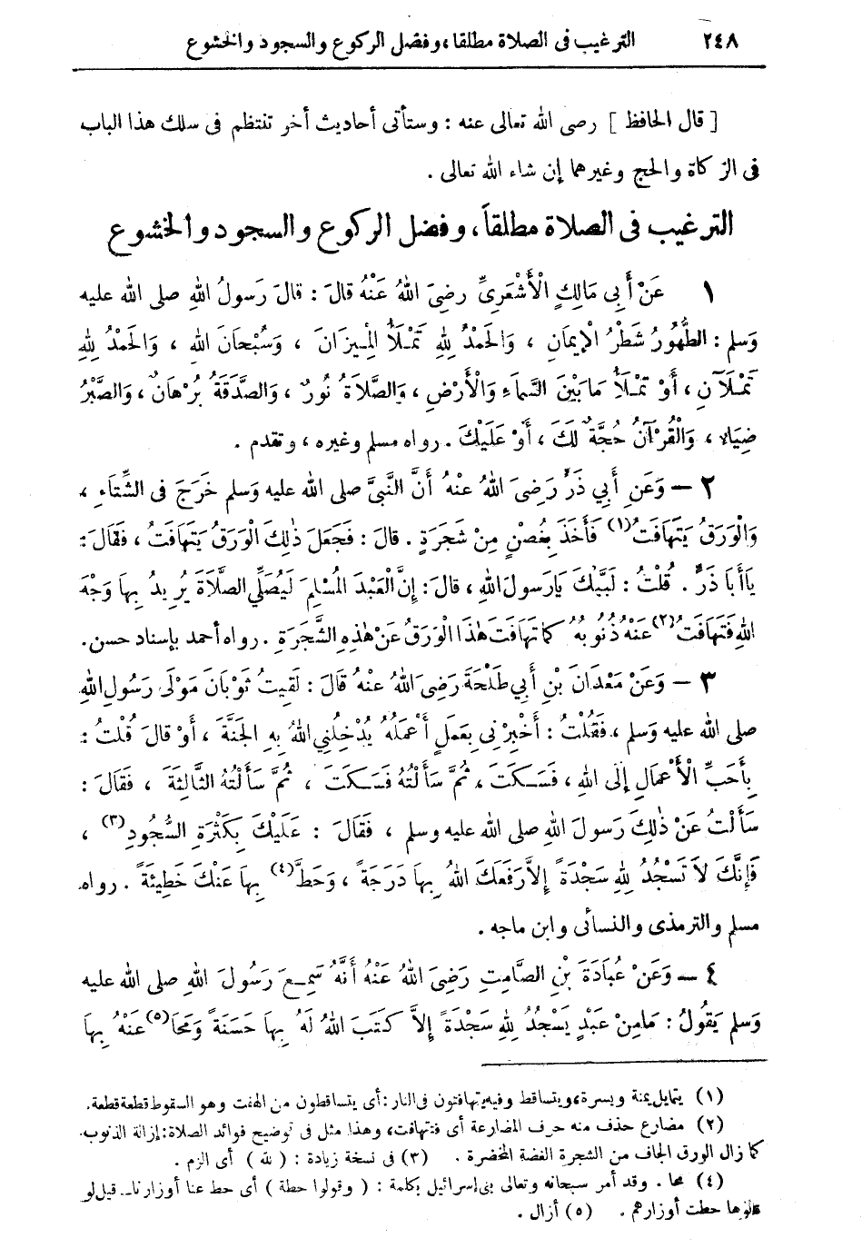 1 - عن أبي مالك الأشعرى رضي الله عنه قال: قال رسول الله صلى الله عليه وسلم: الطهور شطر الإيمان، والحمد لله تملأُ الميزان، وسبحان الله، والحمد لله تملآن، أو تملأُ ما بين السماء والأرض، والصلاة نورٌ، والصدقة برهانٌ، والصبر ضياءٌ، والقرآن حجة لك، أو عليك. رواه مسلم وغيره، وتقدم.