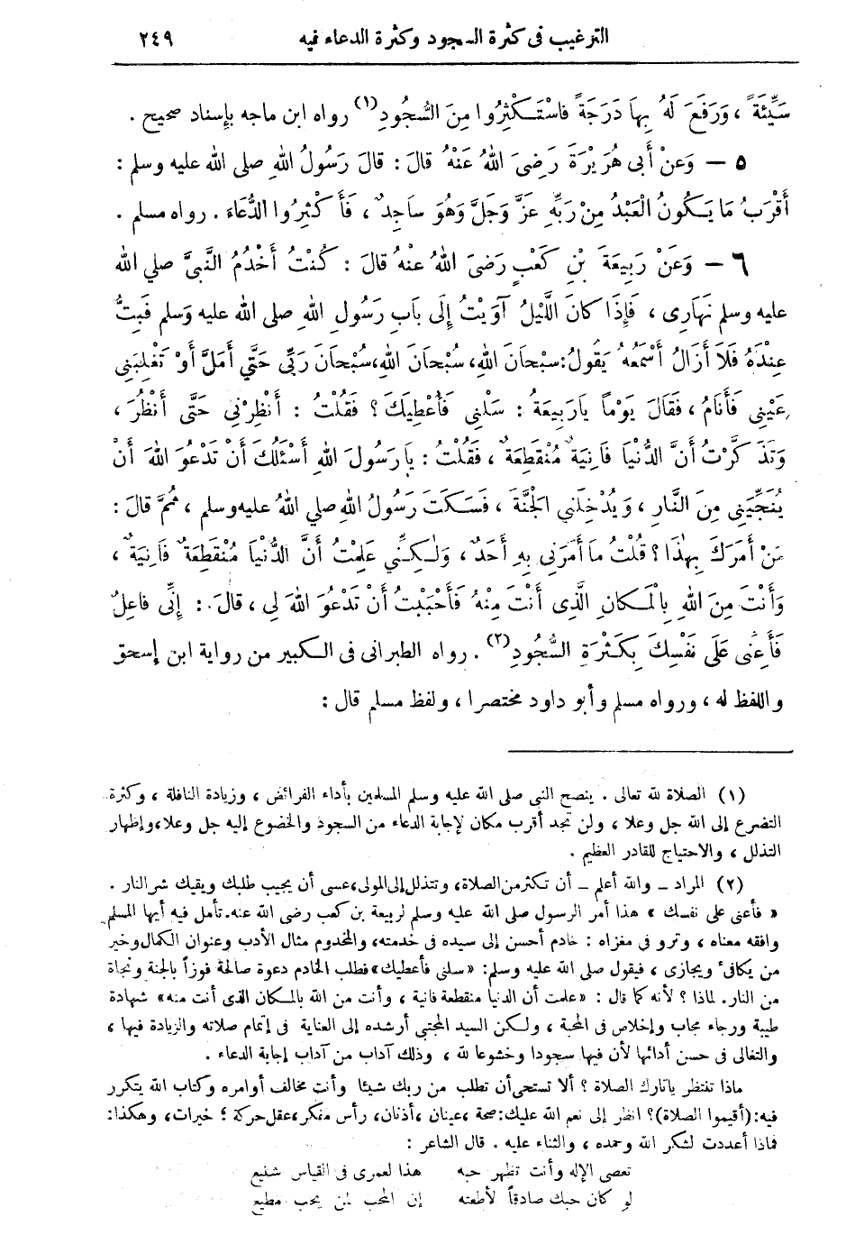 (¬2) المراد - والله أعلم - أن تكثر من الصلاة، وتتذلل إلى المولى، عسى أن يجيب طلبك ويقيك شر النار. (فأعنى على نفسك) هذا أمر الرسول صلى الله عليه وسلم لربيعة بن كعب رضي الله عنه. تأمل فيه أيها المسلم وافقه معناه، وترو في مغزاه: خادم أحسن إلى سيده في خدمته، والمخدوم مثال الأدب وعنوان الكمال وخير من يكافئ ويجازى، فيقول صلى الله عليه وسلم: (سلنى فأعطيك) فطلب الخادم دعوة صالحة فوزاً بالجنة ونجاة من النار. لماذا؟ لأنه كما قال: (علمت أن الدنيا منقطعة فانية، وأنت من الله بالمكان الذى أنت منه) شهادة طيبة ورجاء مجاب وإخلاص في المحبة، ولكن السيد المجتبى أرشده إلى العناية في إتمام صلاته والزيادة فيها، والتغالى في حسن أدائها لأن فيها سجودا وخشوعا لله، وذلك آداب إجابة الدعاء.