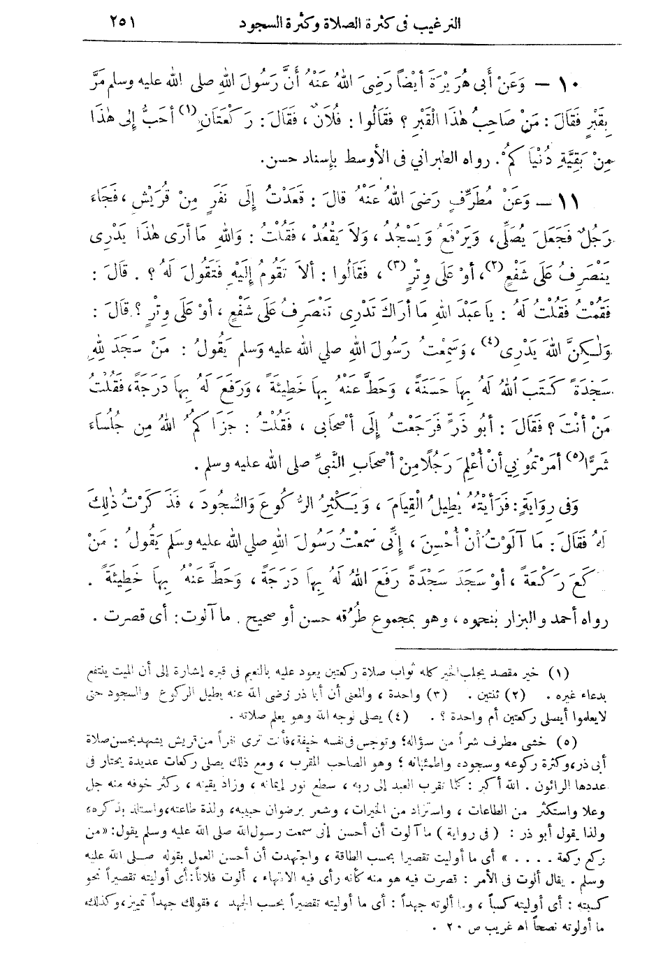 11 - وعن مُطَرِّفٍ رضي الله عنه قال: قعدت إلى نفرٍ من قريشٍ، فجاء رجلٌ فجعل يُصلى، ويرفع ويسجد، ولا يقعد، فقلت: والله ما أرى هذا يدرى ينصرف على شفعٍ (¬2)، أو على وترٍ (¬3)، فقالوا: ألا تقوم إليه فتقول له؟. قال: فقمت فقلت له: يا عبد الله ما أراك تدرى تنصرف على شفعٍ، أو على وترٍ؟ قال: ولكن الله يدرى (¬4)، وسمعت رسول الله صلى الله عليه وسلم يقول: من سجد لله سجدةً كتب الله له بها حسنةً، وحط عنه بها خطيئة، ورفع له بها درجة، فقلت من أنت؟ فقال: أبو ذرً فرجعت إلى أصحاب، فقلت: جزاكمُ الله من جلساء شراً (¬5) أمرتمونى أن أُعلم رجُلاً من أصحاب النبى صلى الله عليه وسلم.