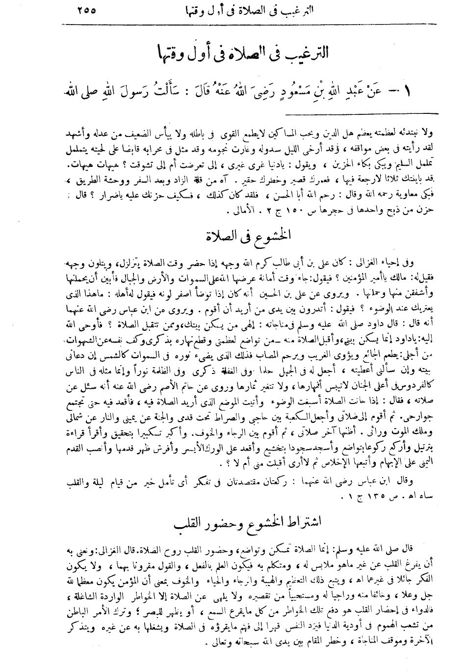 وفي إحياء الغزالي: كان على بن أبى طالب كرم الله وجهه إذا حضر وقت الصلاة يتزلزل، ويتلون وجهه فقيل له: مالك يا أمير المؤمنين؟ فيقول: جاء وقت أمانة عرضها الله على السموات والأرض والجبال فأبين أن يحملها وأشفقن منها وحملها. ويروى عن على بن الحسين أنه كان إذا توضأ اصفر لونه فيقول له أهله: ما هذا الذى يعتريك عند الوضوء؟ فيقول: أتدرون بين يدى من أريد أن أقوم. ويروى عن ابن عباس رضي الله عنهما أنه قال: قال داود صلى الله عليه وسلم في مناجاته: إلهى من يسكن بيتك، وممن تتقبل الصلاة؟ فأوحى الله إليه: يا داود إنما يسكن بيتى، وأقبل الصلاة منه - من تواضع لعظمتى وقطع نهاره بذكرى وكف نفسه عن الشهوات من أجلى: يطعم الجائع ويؤوى الغريب ويرحم المصاب فذلك الذى يضوء نوره في السموات كالشمس إن دعانى لبيته وإن سألنى أعطيته، أجعل له في الجهل حلما وفي الغفلة ذكرى وفي الظلمة نوراً وإنما مثله في الناس كالفردوس في أعلى الجنان لا تيبس أنهارها، ولا تتغير ثمارها وروى عن حاتم الأصم رضي الله عنه أنه سئل عن صلاته، فقال: إذا حانت الصلاة أسبغت الوضوء وأتيت الموضع الذى أريد الصلاة فيه، فأقعد فيه حتى تجتمع جوارحى، ثم أقوم إلى صلاتى وأجعل الكعبة بين حاجبى والصراط تحت قدمى والجنة عن يمنى والنار عن شمالى وملك الموت ورائى. أظنها آخر صلاتى، ثم أقوم بين الرجاء والخوف. وأكبر تكبيرا بتحقيق وأقرأ قراءة بترتيل وأركع ركوعا بتواضع وأسجد سجودا بتخشيع وأقعد على الورك الأيسر وأفرش ظهر قدمها وأنصب القدم اليمنى على الإبهام وأتبعها الإخلاص ثم لا أرى أقبلت منى أم لا؟.