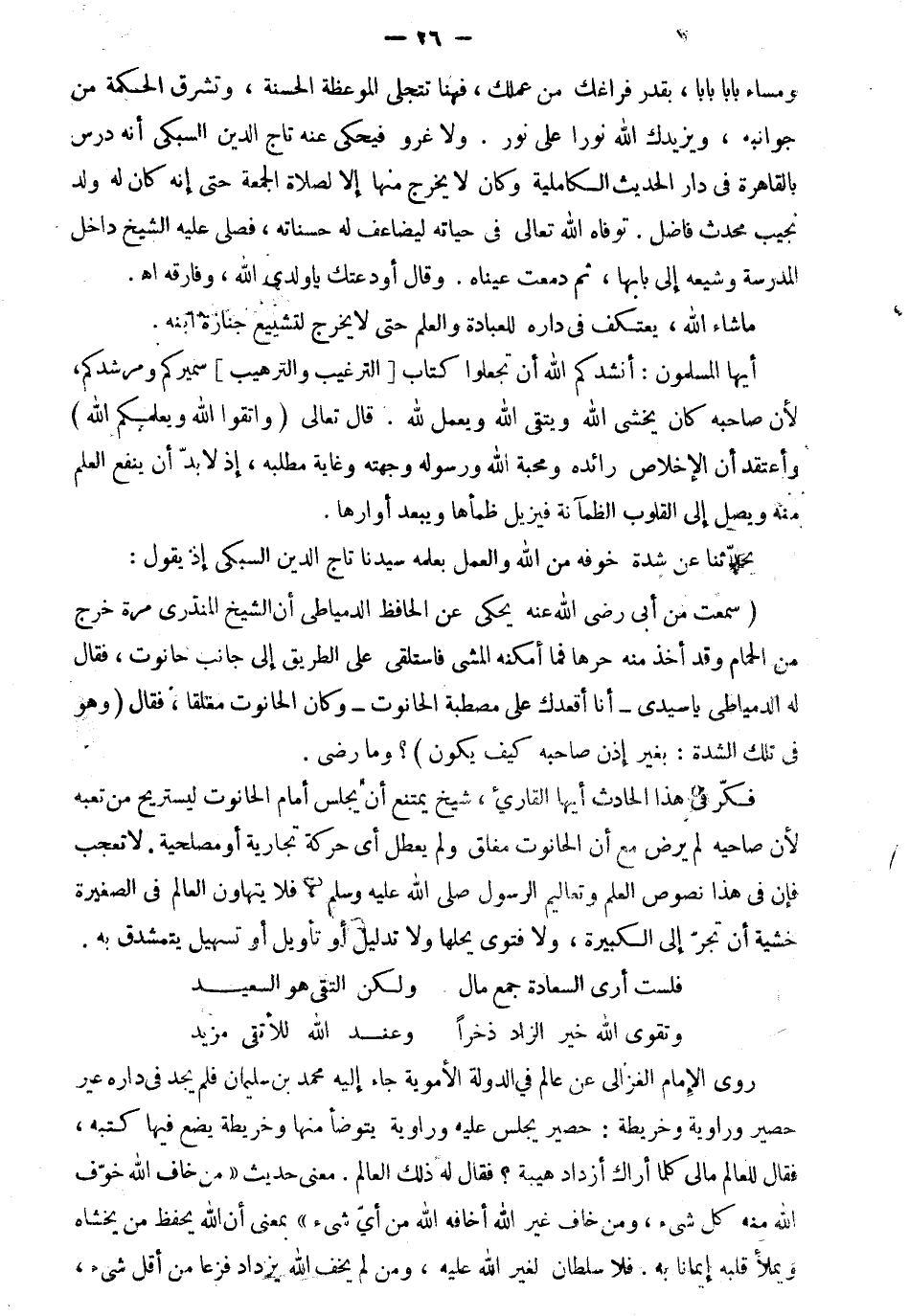 ومساء بابا بابا، بقدر فراغك من عملك، فهنا تتجلى الموعظة الحسنة، وتشرق الحكمة من جوانبه، ويزيدك الله نورا على نور. ولا غرو فيحكى عنه تاج الدين السبكى أنه درس بالقاهرة في دار الحديث الكاملية وكان لا يخرج منها إلا لصلاة الجمعة حتى إنه كان له ولد نجيب محدث فاضل. توفاه الله في حياته ليضاعف له حسانته، فصلى عليه الشيخ داخل المدرسة وشيعه إلى بابها، ثم دمعت عيناه. وقال أودعتك يا ولدى الله، وفارقه أهـ.