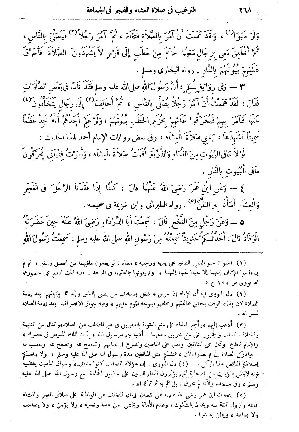 (¬4) قال النووي: إن هؤلاء المتخلفين كانوا منافقين، وسياق الحديث يقتضيه فإنه لا يظن بالمؤمنين من الصحابة أنهم يؤثرون العظم السمين على حضور الجماعة مع رسول الله صلى الله عليه وسلم، وفي مسجده ولأنه لم يحرق. بل هم به ثم تركه أهـ.