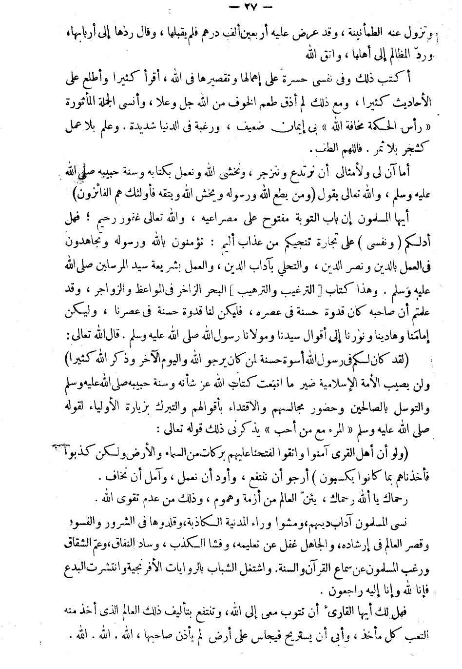 نسى المسلمون آداب دينهم، ومشوا وراء المدنية الكاذبة، وقلدوها في الشرور والفسوق وقصر العالم في إرشاده، والجاهل غفل عن تعليمه، وفشا الكذب، وساد النفاق، وعمّ الشقاق ورغب المسلمون عن سماع القرآن والسنة. واشتغل الشباب بالروايات الأفرنجية وانتشرت البدع فإنا لله وإنا إليه راجعون.