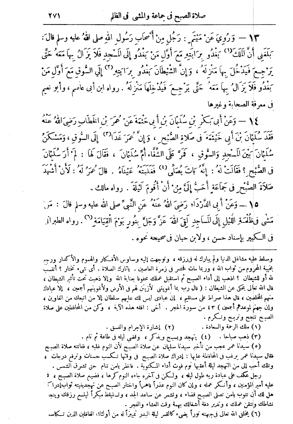 15 - وعن أبي الدرداء رضي الله عنه عن النبى صلى الله عليه وسلم قال: من مشى في ظلمة الليل إلى المساجد لقى الله عز وجل بنورٍ يوم القيامة (¬5). رواه الطبراني في الكبير بإسناد حسن، ولابن حبان في صحيحه نحوه.