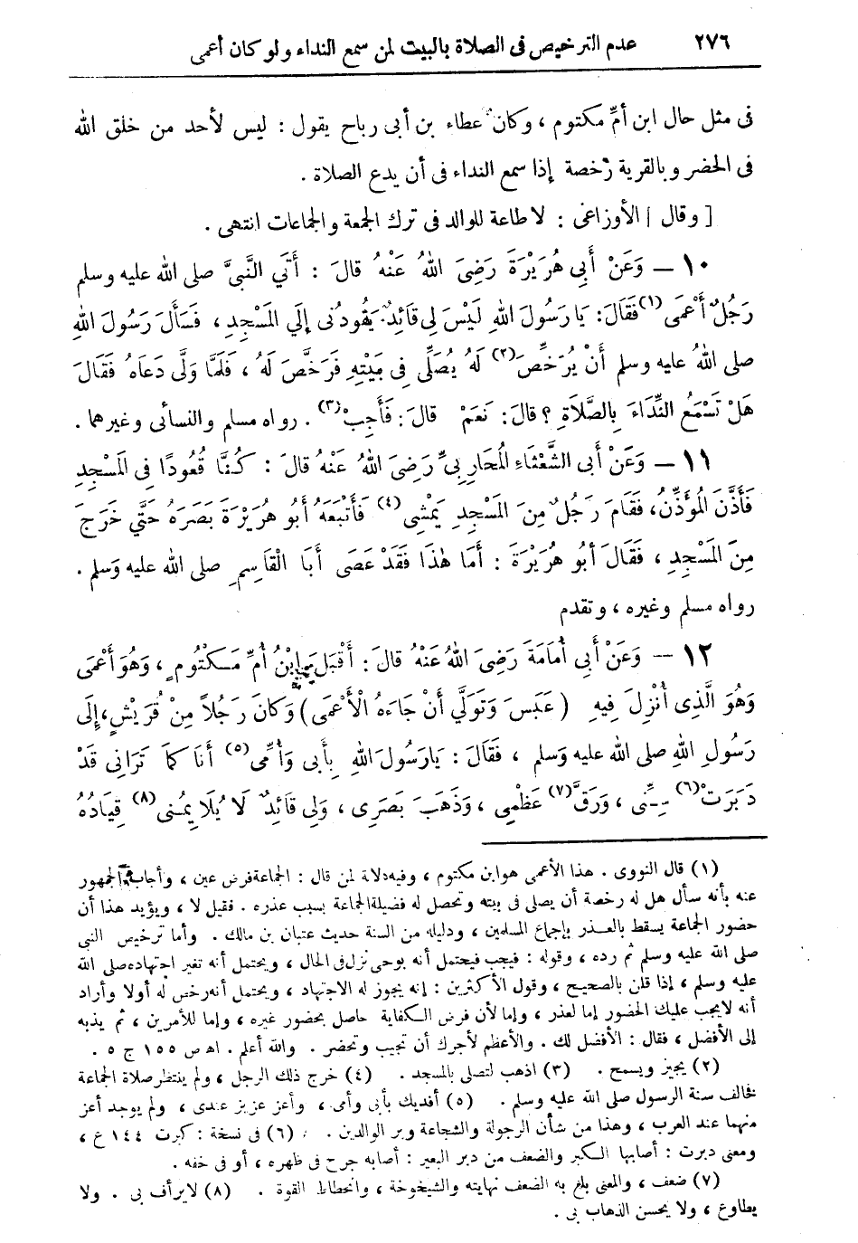 (¬1) قال النووي. هذا الاعمى هو ابن مكتوم، وفيه دلالة لمن قال: الجماعة فرض عين، واجاب الجمهور عنه بأنه سأل هل له رخصة أن يصلى في بيته وتحصل له فضيلة الجماعة بسبب عذره. فقيل لا، ويؤيد هذا أن حضور الجماعة يسقط بالعذر بإجماع المسلمين، ودليله من السنة حديث عتبان بن مالك. وأما ترخيص النبى صلى الله عليه وسلم ثم رده، وقوله: فيجب فيحتمل أنه بوحى نزل في الحال، ويحتمل أنه تغير اجتهاده صلى الله عليه وسلم، إذا قلن بالصحيح، وقول الأكثرين: إنه يجوز له الاجتهاد، ويحتمل أنه رخص له أولا وأراد أنه لا يجب عليك الحضور إما لعذر، وإما لأن فرض الكفاية حاصل بحضور غيره، وإما للأمرين، ثم يذبه إلى الأفضل، فقال: الأفضل لك. والأعظم لأجرك أن تجيب وتحضر. والله أعلم. أهـ ص 155 جـ 5.