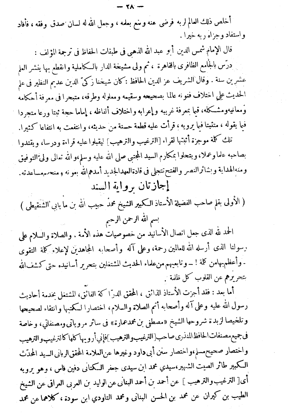 أما بعد: فقد أجزت الأستاذ الذائق، المحقق الدرّاكة الفائق، المشتغل بخدمة أحاديث رسول الله صلى الله عليه وعلى آله وأصحابه أتم الصلاة والسلام، اختصاراً لكتبها وانتقاء لصحيحها وتلخيصا لزبدة شروحها الشيخ (مصطفى بن محمد عمارة) في سائر مروياتى ومصنفاتى، وخاصة في جمع مصنفات الحافظ المنذري صاحب (الترغيب والترهيب) فانى أرويها كلها كالترغيب والترهيب، واختصار صحيح مسلم، واختصار سنن أبى داود وغيرها عن العلامة المحقق الرباني السيد المحدّث الكبير طائر الصيت الشهير، سيدى محمد ابن سيدى جعفر الكتانى دفين فاس، وهو يرويه أي (الترغيب والترهيب) عن أحمد بن أحمد البنانى عن الوليد بن العربى العراقى عن الشيخ الطيب بن كيران عن محمد بن الحسن البنانى ومحمد التاودى ابن سودة، كلاهما عن محمد