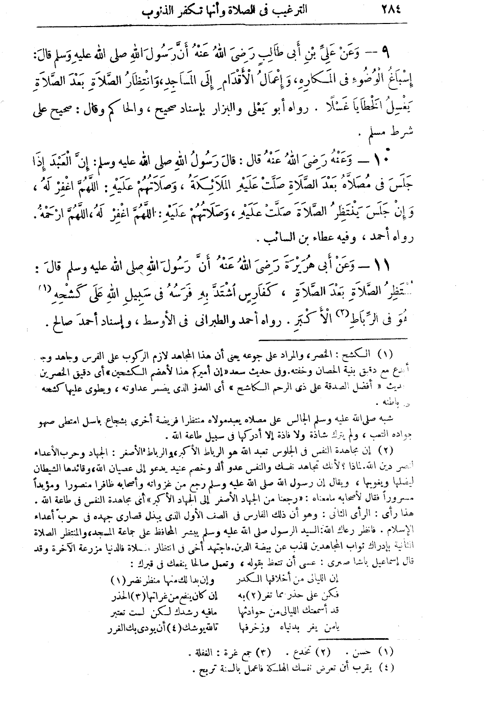 9 - وعن على بن أبي طالب رضي الله عنه أن رسول الله صلى الله عليه وسلم قال: إسباغ الوضوء في المكاره، وإعمال الأقدام إلى المساجد، وانتظار الصلاة بعد الصلاة يغسل الخطايا غسلاً. رواه أبو يعلى والبزار بإسناد صحيح، والحاكم وقال: صحيح على شرط مسلم.