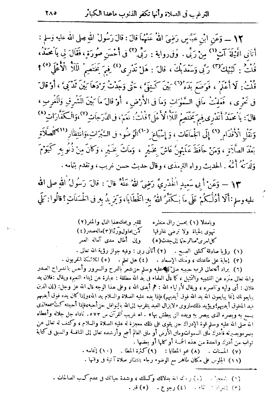 12 - وعن أبن عباس رضي الله عنهما قال: قال رسول الله صلى الله عليه وسلم: أتانى الليلة آت (¬1) من ربى. وفي رواية: ربى (¬2) في أحسن صورةٍ، فقال لى يا محمد، قلت: لبيك (¬3) ربى وسعديك، قال: هل تدرى (¬4) فيم يختصم الملأُ الأعلى (¬5)؟ قلت: لا أعلم، فوضع يده (¬6) بين كتفى، حتى وجدت بردها بين ثدي، أو قال في نحرى، فعلمت ما في السموات وما فى الأرض، أو قال ما بين المشرق والمغرب، قال: يا محمد أتدرى فيم يختصم الملأ الأعلى؟ قلت: نعم، في الدرجات (¬7)، والكفارات (¬8) ونقل الأقدام (¬9) إلى الجماعات، وإسباغ (¬10) الوضوء في السبرات وانتظار (¬11) الصلاة بعد الصلاة، ومن حافظ عليهن عاش بخيرٍ، ومات بخيرٍ، وكان من ذنوبه كيوم ولدته أمه. الحديث رواه الترمذي، وقال حديث حسن غريب، وتقدم بتمامه.