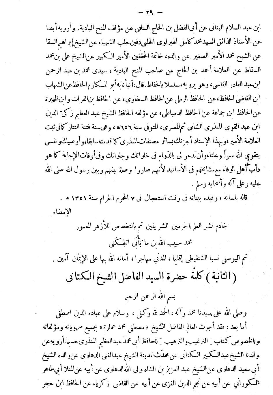 (الثانية) كلمة حضرة السيد الفاضل الشيخ الكتانى