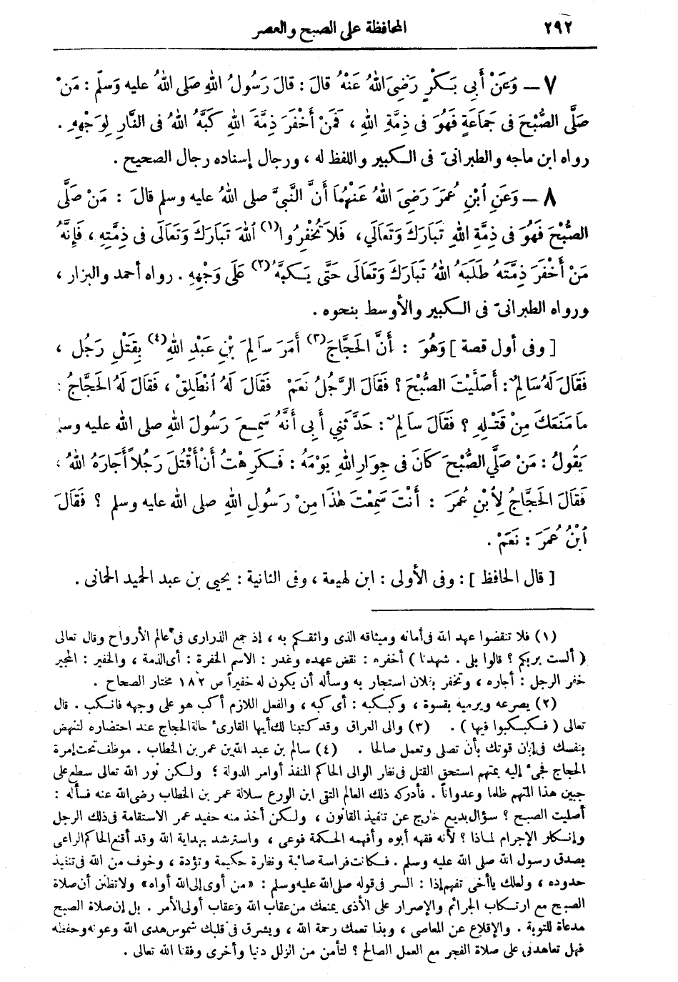 (وفى أول قصة) وهو: أن الحجاج (¬3) أمر سالم بن عبد الله (¬4) بقتل رجل، فقال له سالم: أصليت الصبح؟ فقال الرجل نعم فقال له انطلق، فقال له الحجاج: ما منعك من قتله؟ فقال سالم: حدثنى أبى أنه سمع رسول الله صلى الله عليه وسلم يقول: من صلى الصبح كان في جوار الله يومه: فكرهت أن أقتل رجلاً أجاره الله، فقال الحجاج لابن عمر: أنت سمعت هذا من رسول الله صلى الله عليه وسلم؟ فقال ابن عمر: نعم.