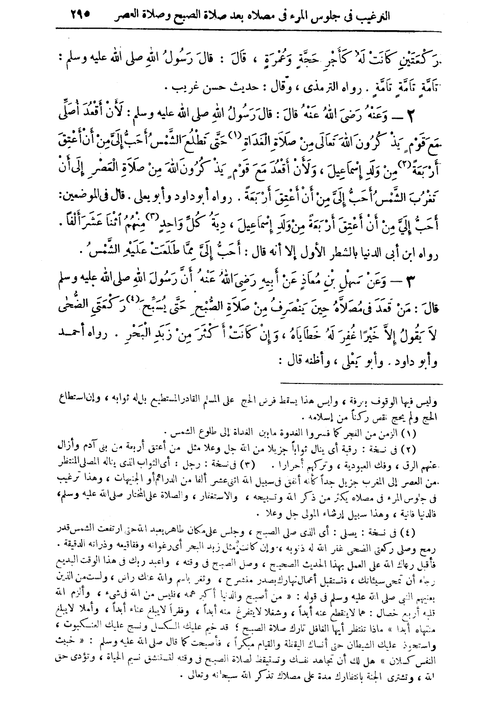 (¬2) في نسخة: رقبة أي ينال ثواباً جزيلا من الله جل وعلا مثل من أعتق أربعة من بنى آدم وأزال عنهم الرق، وفك العبودية، وتركهم أحرارا.