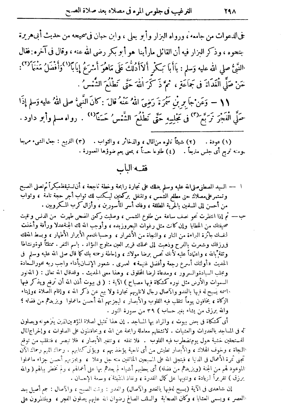 11 - وعن جابر بن سمرة رضي الله عنه قال: كان النبى صلى الله عليه وسلم إذا صلى الفجر تربع (¬3) في مجلسه حتى تطلع الشمس حسناً (¬4).