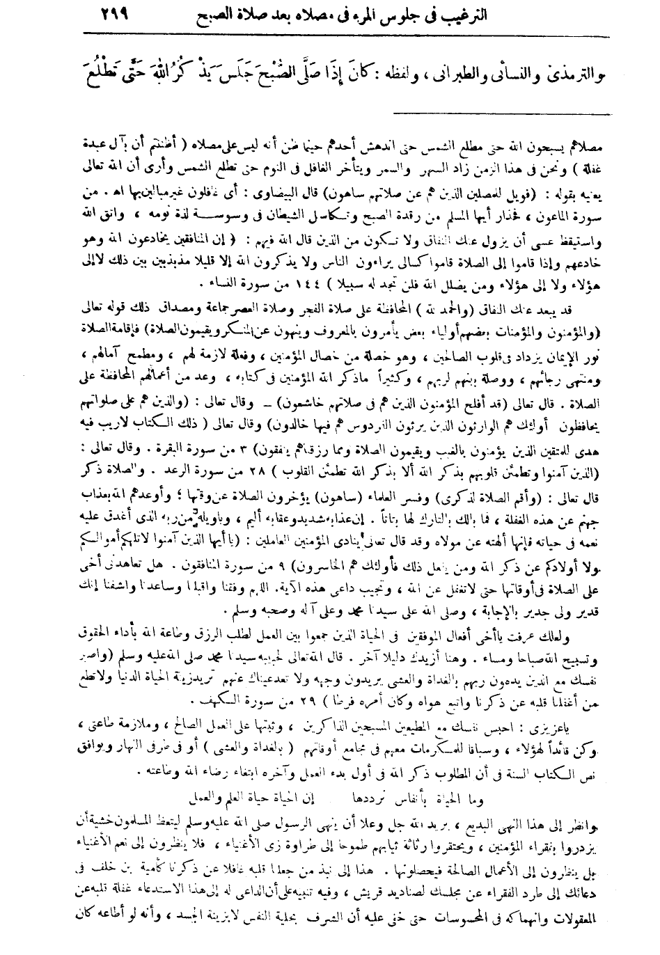 = مصلاهم يسبحون الله حتى مطلع الشمس حتى اندهش أحدهم حينما ظن أنه ليس على مصلاه (أظننتم أن بآل عبدة غفلة) ونحن في هذا الزمن زاد السهر والسمر ويتأخر الغافل في النوم حتى تطلع الشمس وأرى أن الله تعلى يعنيه بقوله: (فويل للمصلين الذين هم عن صلاتهم ساهون) قال البيضاوى: أي غافلون غير مبالين بها أهـ. من سورة الماعون، فحذار أيها المسلم من رقدة الصبح وتكاسل الشيطان في وسوسة لذة نومه، واتق الله واستيقظ عسى أن يزول عنك النفاق ولا تكون من الذين قال الله فيهم: (إن المنافقين يخادعون الله وهو خادعهم وإذا قاموا إلى الصلاة قاموا كسالى يراءون الناس ولا يذكرون الله إلا قليلا مذبذبين بين ذلك لا إلى هؤلاء ولا إلى هؤلاء ومن يضلل الله فلن تجد له سبيلا) 144. من سورة النساء.