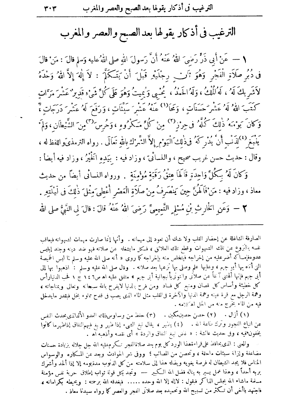 1 - عن أبي ذر رضي الله عنه أن رسول الله صلى الله عليه وسلم قال: من قال في دبر صلاة الفجر وهو ثانٍ رجليه قبل أن يتكلم: لا إله إلا الله وحده لا شريك له، له الملك وله الحمد، يحيى ويميت وهو على كل شئ قدير عشر مراتٍ كتب الله له عشر حسناتٍ، ومحا (¬1) عنه عشر سيئاتٍ، ورفع له عشر درجات، وكان يومه ذلك كله في حرزٍ (¬2) من كل مكروهٍ، وحُرِسَ (¬3) من الشيطان، ولم ينبغ (¬4)