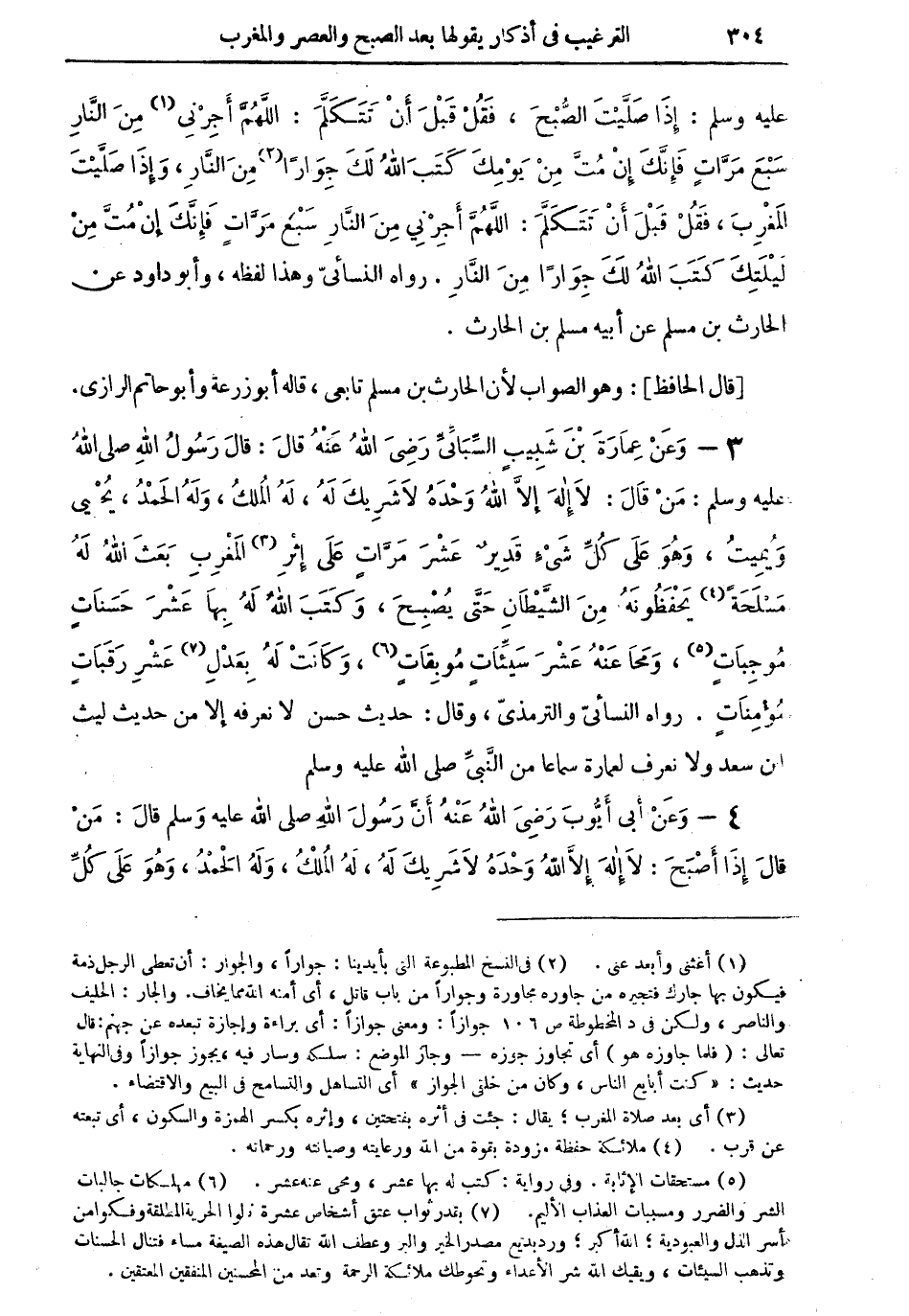 عليه وسلم: إذا صليت الصبح، فقل قبل أن تتكلم: اللهم أجرنى (¬1) من النار سبع مراتٍ فإنك إن مت من يومك كتب الله لك جواراً (¬2) من النار، وإذا صليت المغرب، فقل قبل أن تتكلم: اللهم أجرنى من النار سبع مراتٍ فإنك إن مت من ليلتك كتب الله لك جواراً من النار. رواه النسائي وهذا لفظه، وأبو داود عن الحارث بن مسلم عن أبيه مسلم بن الحارث.