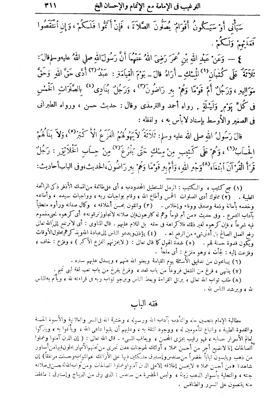 4 - وعن عبد الله بن عمر رضي الله عنه أن رسول الله صلى الله عليه وسلم قال: ثلاثة على كثبان (¬1) المسك - أراهُ قال - يوم القيامة: عبدٌ (¬2) أدى حق الله وحق مواليه، ورجلٌ أمَّ قوما وهم به راضون (¬3)، ورجل ينادى (¬4) بالصلوات الخمس في كل يومٍ وليلةٍ. رواه أحمد والترمذي وقال: حديث حسن، وراه الطبراني في الصغير والأوسط بإسناد لا بأس به، ولفظه: