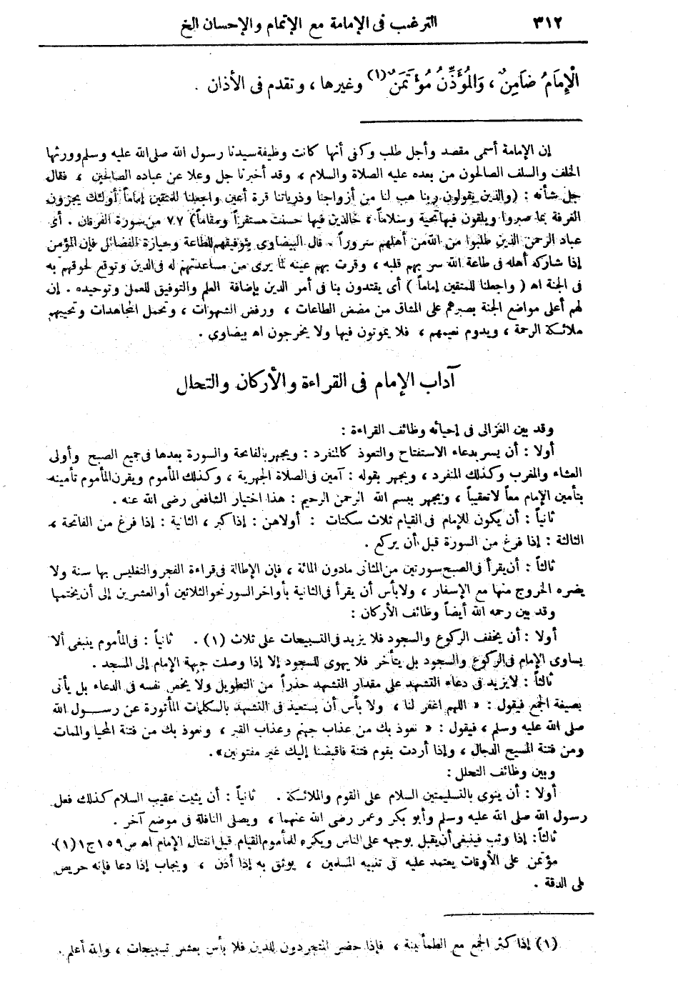 = إن الإمامة أسمى مقصد وأجل طلب وكفى أنها كانت وظيفة سيدنا رسول الله صلى الله عليه وسلم وورثها الخلف والسلف الصالحون من بعده عليه الصلاة والسلام، وقد أخبرنا جل وعلا عن عباده الصالحين، فقال جل شأنه: (والذين يقولون ربنا هب لنا من أزواجنا وذرياتنا قرة أعين واجعلنا للمتقين إماما أولئك يجون الغرفة بما صبروا ويلقون فيها تحية وسلاماً، خالدين فيها حسنت مستقراً ومقاماً) 77 من سورة الفرقان. أي عباد الرحمن الذين طلبوا من الله من أهلهم سروراً. قال البيضاوى بتوفيقهم للطاعة وحيازة الفضائل فإن المؤمن إذا شاركه أهله في طاعة الله سر بهم قلبه، وقرت بهم عينه لما يرى من مساعدتهم له في الدين وتوقع لحوقهم به في الجنة أهـ (واجعلنا للمتقين إماماً) أي يقتدون بنا في أمر الدين بإضافة العلم والتوفيق للعمل وتوحيده. إن لهم أعلى مواضع الجنة بصبرهم على المشاق من مضض الطاعات، ورفض الشهوات، وتحمل المجاهدات وتحييهم ملائكة الرحمة، ويدوم نعيمهم، فلا يموتون فيها ولا يخرجون أهـ بيضاوى.