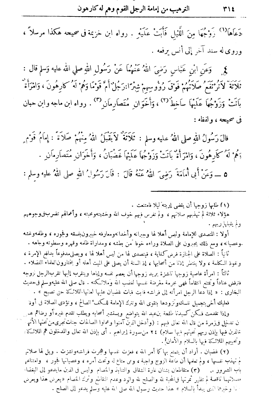 4 - وعن ابن عباس رضي الله عنهما عن رسول الله صلى الله عليه وسلم قال: ثلاثة لا تُرتفع صلاتهم فوق رؤوسهم شبراً: رجل أم قوماً وهم له كارهون، وامرأةٌ باتت وزوجها عليها ساخط (¬2)، وأخوان متصارمان (¬3). رواه ماجه وابن حبان في صحيحه، ولفظه: