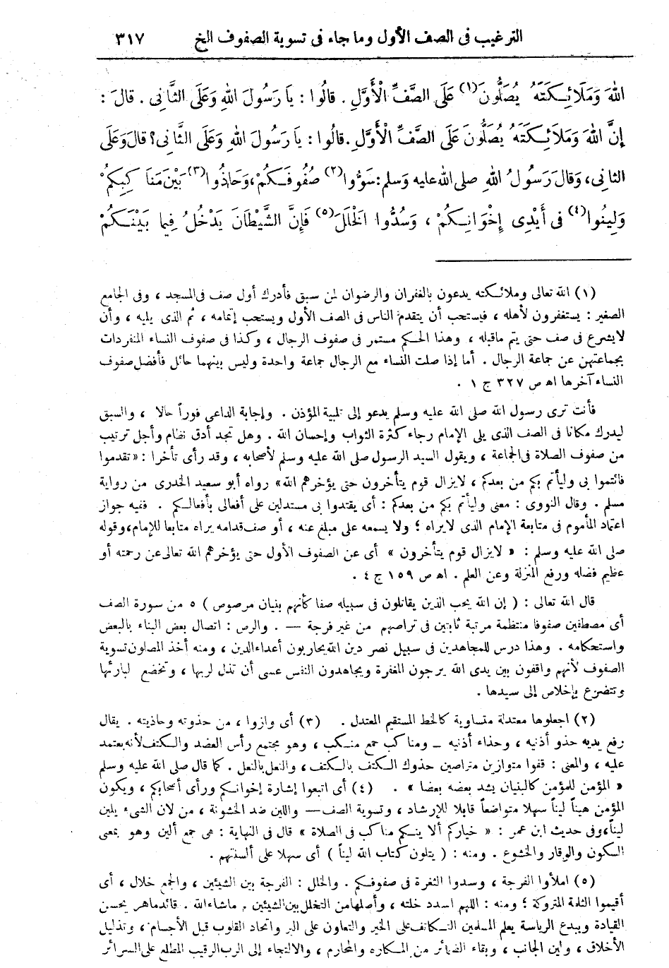قال الله تعالى: (إن الله يحب الذين يقاتلون في سبيله صفا كأنهم بنيان مرصوص) 5 من سورة الصف أي مصطفين صفوفا منتظمة مرتبة ثابتين في تراصهم من غير فرجة -. والرص: اتصال بعض البناء بالبعض واستحكامه. وهذا درس للمجاهدين في سبيل نصر دين الله يحاربون أعداء الدين، ومنه أخذ المصلون تسوية لصفوف لأنهم واقفون بين يدي الله يرجون المغفرة ويجاهدون النفس عسى أن تذل لربها، وتضخع لبارئها وتتضرع بإخلاص إلى سيدها.