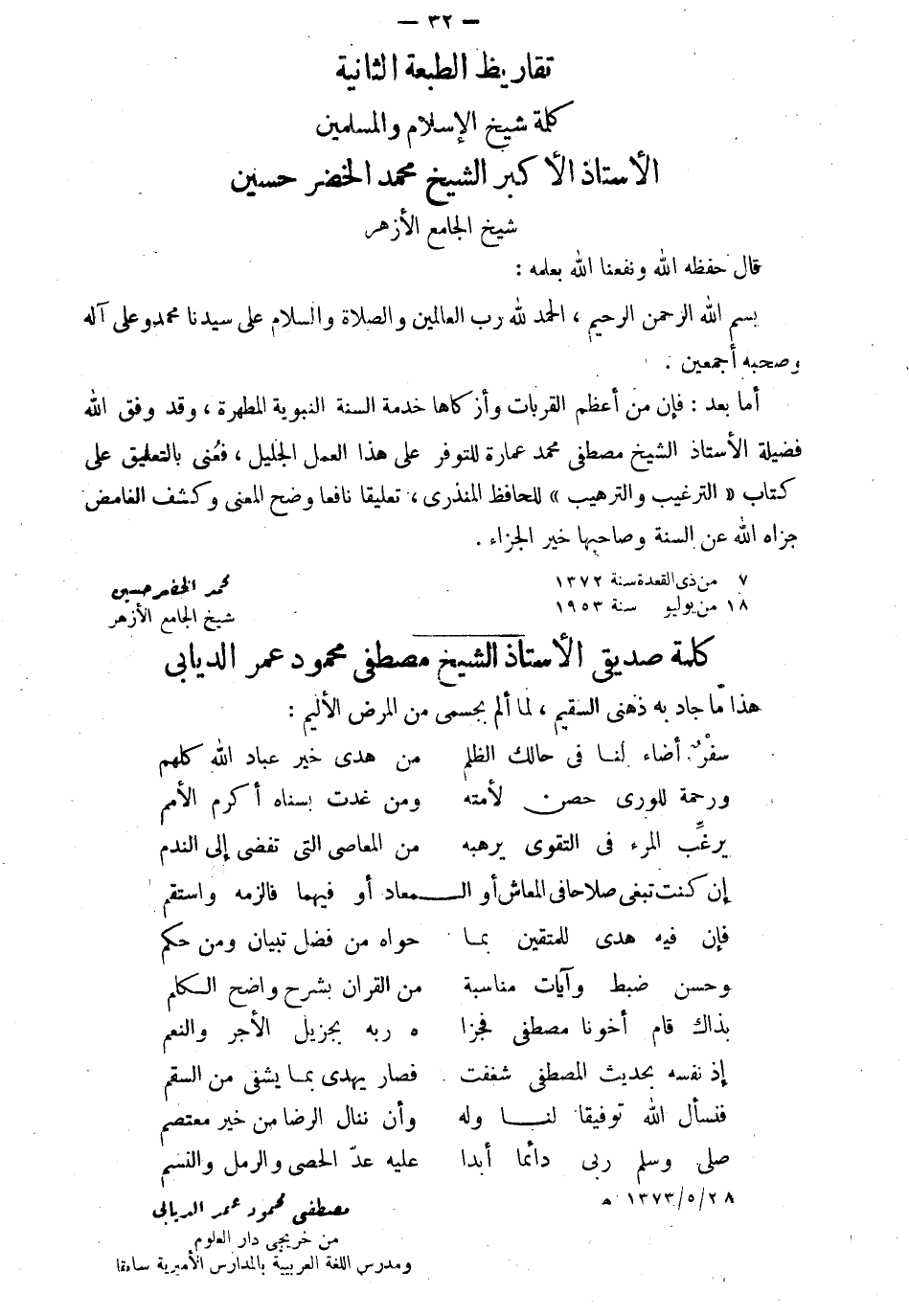 أما بعد: فإن من أعظم القربات وأزكاها خدمة السنة النبوية المطهرة، وقد وفق الله فضيلة الأستاذ الشيخ مصطفى محمد عمارة للتوفر على هذا العمل الجليل، فعُنى بالتعليق على كتاب (الترغيب والترهيب) للحافظ المنذري، تعليقا نافعا وضح المعنى وكشف الغامض: جزاه الله من السنة وصاحبها خير الجزاء.