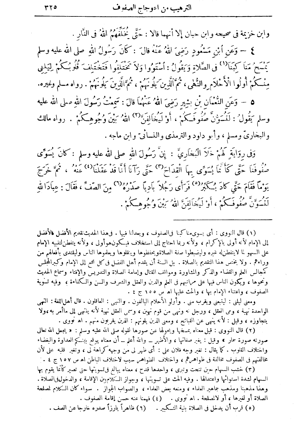 5 - وعن النعمان بن بشيرٍ رضي الله عنهما قال: سمعت رسول الله صلى الله عليه وسلم يقول: لتسؤُّن صفوفكم، أو ليخالفن (¬2) الله بين وجوهكم. رواه مالك والبخاري ومسلم، وأبو داود والترمذي والنسائي وابن ماجه.