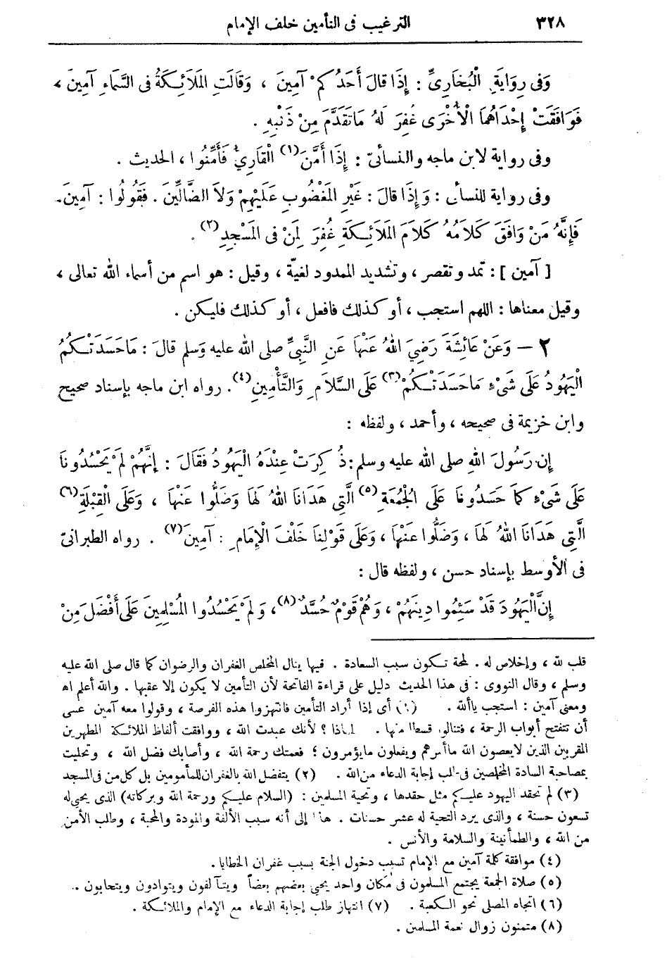 إن رسول الله صلى الله عليه وسلم: ذُكرت عنده اليهود فقال: إنهم لم يحسدونا على شئٍ كما حسدونا على الجمعة (¬5) التى هدانا الله لها وضلوا عنها، وعلى القبلة (¬6) التى هدانا الله لها، وضلوا عنها، وعلى قولنا خلف الإمام: آمين (¬7). رواه الطبراني في الأوسط بإسناد حسن، ولفظه قال: