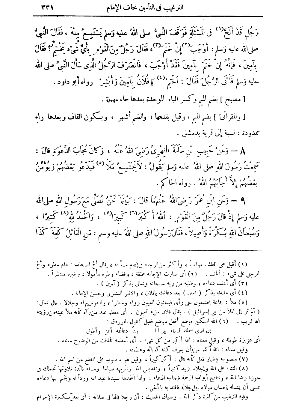 رجلٍ قد ألحَّ (¬1) في المسئلة فوقف النبى صلى الله عليه وسلم يستمع منه، فقال النبى صلى الله عليه وسلم: أوجب (¬2) إن ختم (¬3)، فقال رجلٌ من القوم بأى شئٍ يختمُ؟ فقال بآمين. فإنه إن ختم بآمين فقد أوجب، فانصرف الرجل الذى سأل النبى صلى الله عليه وسلم فأتى الرجل فقال: اختم (¬4) يافلان بآمين وأبشر. رواه أبو داود.