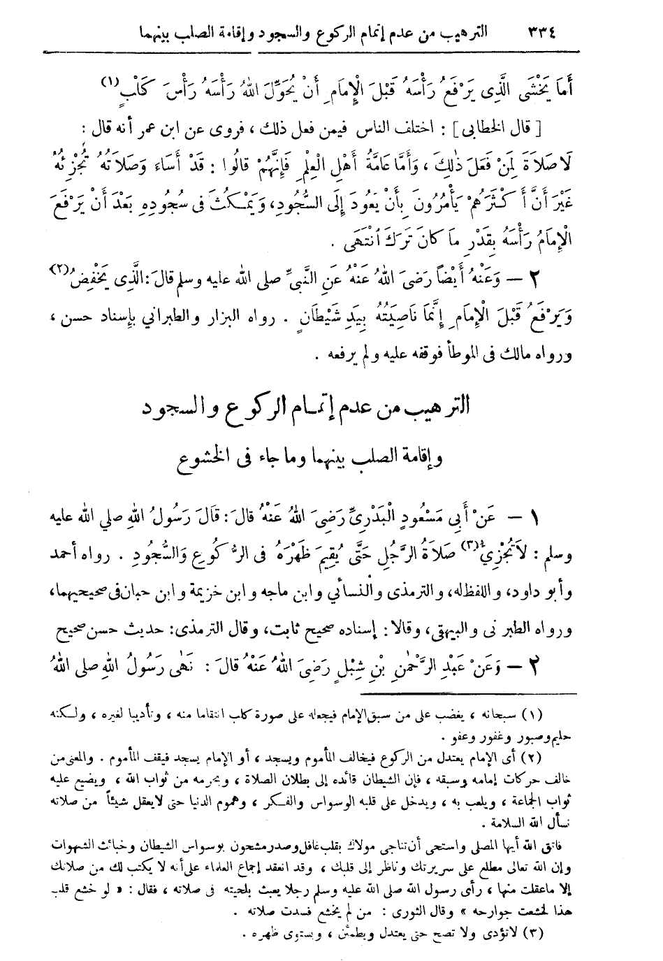 1 - عن أبي مسعود البدرى رضي الله عنه قال: قال رسول الله صلى الله عليه وسلم: لا تُجزئُ (¬3) صلاة الرجل حتى يُقِيمَ ظهره في الرُكوع والسجود. رواه أحمد وأبو داود، واللفظ له، والترمذي والنسائي وابن ماجه وابن خزيمة وابن حبان في صحيحيهما، ورواه الطبراني والبيهقي، وقالا: إسناده صحيح ثابت، وقال الترمذي: حديث حسن صحيح.