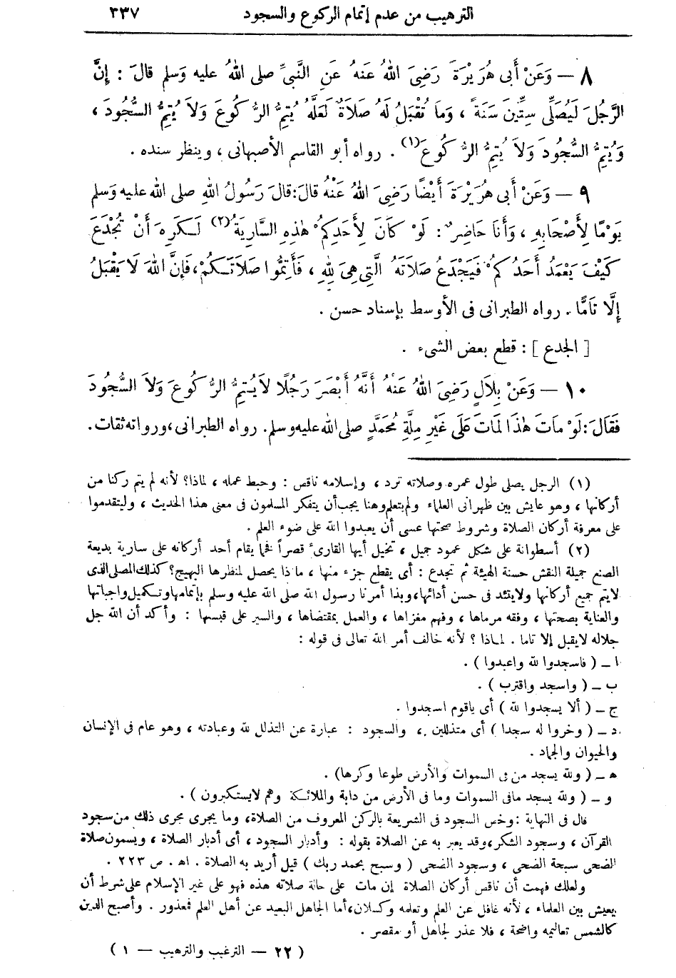(¬2) أسطوانة على شكل عمود جميل، تخيل أيها القارئ قصراً فخماً يقام أحد أركانه على سارية بديعة الصنع جميلة النقش حسنة الهيئة ثم تجدع: أي يقطع جزء منها، ماذا يحصل لمنظرها البهيج؟ كذلك المصلى الذى لا يتم جميع أركانها ولا يتئد في حسن أدائها، وبذا أمرنا رسول الله صلى الله عليه وسلم بإتمامها وتكميل واجباتها والعناية بصحتها، وفقه مرماها، وفهم مغزاها، والعمل بمقتضاها، والسير على قبسها: وأكد أن الله جل جلاله لا يقبل إلا تاما. لماذا؟ لأنه خالف أمر الله تعالى في قوله:
