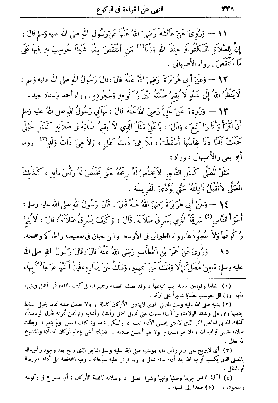 (¬3) أكثر الناس جرما وسلبا ونهبا وشرا المصلى، وصلاته ناقصة الأركان: أي يسرع في ركوعه وسجوده.