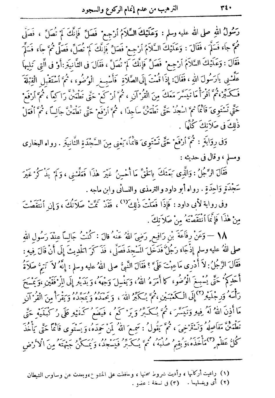 18 - وعن رفاعة بن رافعٍ رضي الله عنه قال: كنت جالساً عند رسول الله صلى الله عليه وسلم إذ جاء رجلٌ فدخل المسجد فصلى، فذكر الحديث إلى أن قال فيه: فقال الرجل: لا أدرى ما عبت على؟ فقال النبى صلى الله عليه وسلم: إنه لا تتمُّ صلاة أحدكم حتى يُسبغ الوضوء، كما أمره الله، ويغسل وجهه، ويديه إلى المرفقين، ويسمح رأسه ورجليه (¬2) إلى الكعبين، ثم يكبر الله، ويحمده ويمجده ويقرأُ من القرآن ما أذن الله له فيه وتيسر، ثم يُكبرُ ويركعُ، فيضعُ كفيه على رُكبتيه حتى تطمئن مفاصله وتسترخى، ثم يقول: سمع الله لمن حمده، ويستوى قائماً حتى يأخذ كل عظيم (¬3) مأخذه، ويقيم صلبه، ثم يكبر فيسجد، ويمكن جبهته من الأرض