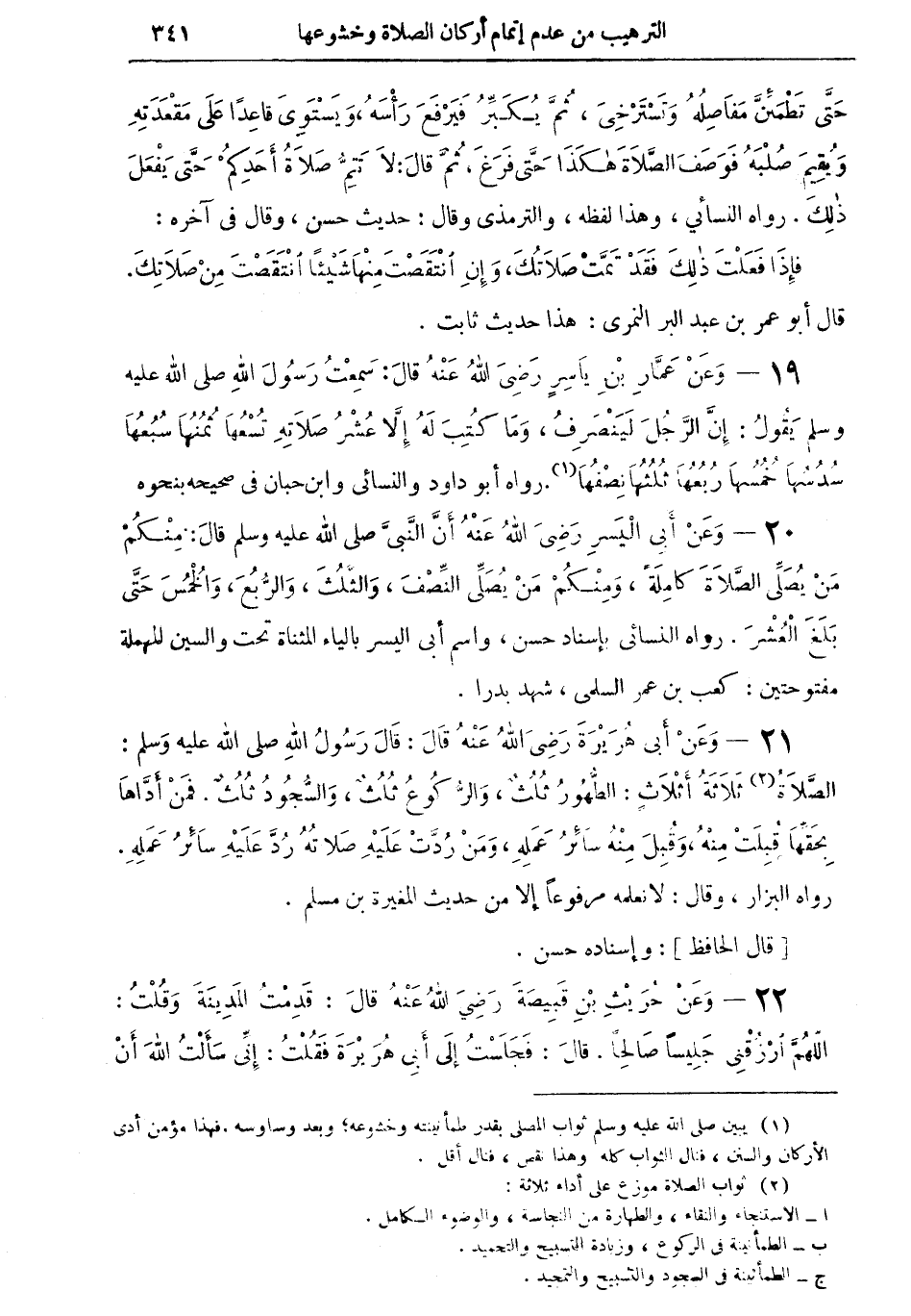19 - وعن عمار بن ياسر رضي الله عنه قال: سمعت رسول الله صلى الله عليه وسلم يقول: إن الرجل لينصرف، وما كُتِبَ له إلا عُشرُ صلاته تُسعها ثُمُنُهَا سُبُعُهَا سُدُسُهَا خُمُسُهَا رُبُعُها ثُلُثُها نِصفُهَا (¬1). رواه أبو داود والنسائي وابن حبان في صحيحه بنحوه.