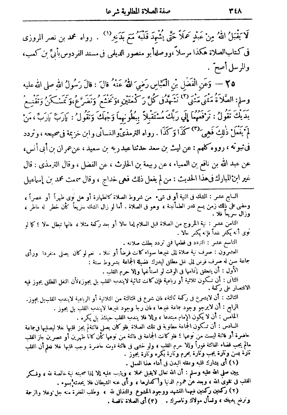 25 - وعن الفضل بن العباس رضي الله عنه قال: قال رسول الله صلى الله عليه وسلم: الصلاة مثنى مثنى (¬2) تشهد في كل ركعتين، وتخشع وتضرعُ، وتمسكنُ وتقنع يديك تقول: ترفعهما إلى ربك مستقبلا ببطونهما وجهك وتقول: يارب يارب، من لم يفعل ذلك فهى (¬3) كذا وكذا. رواه الترمذي والنسائي وابن خزيمة في صحيحه، وتردد في ثبوته، رووه كلهم: عن ليث بن سعد حدثنا عبد ربه بن سعيد، عن عمران بن أبى أنس، عن عبد الله بن نافع بن العمياء، عن ربيعة بن الحارث، عن الفضل، وقال الترمذي: قال غير ابن المبارك في هذا الحديث: من لم يفعل ذلك فهى خداج، وقال سمعت محمد بن إسماعيل