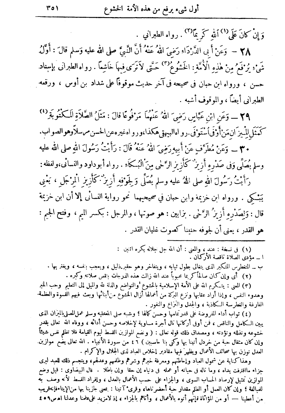 28 - وعن أبي الدرداء رضي الله عنه أن النبى صلى الله عليه وسلم قال: أول شئٍ يُرفعُ من هذه الأُمة: الخشوع (¬3) حتى لا ترى فيها خاشعاً. رواه الطبراني بإسناد حسن، ورواه ابن حبان في صحيحه في آخر حديث موقوفاً على شداد بن أوس، ورفعه الطبراني أيضاً، والموقوف أشبه.