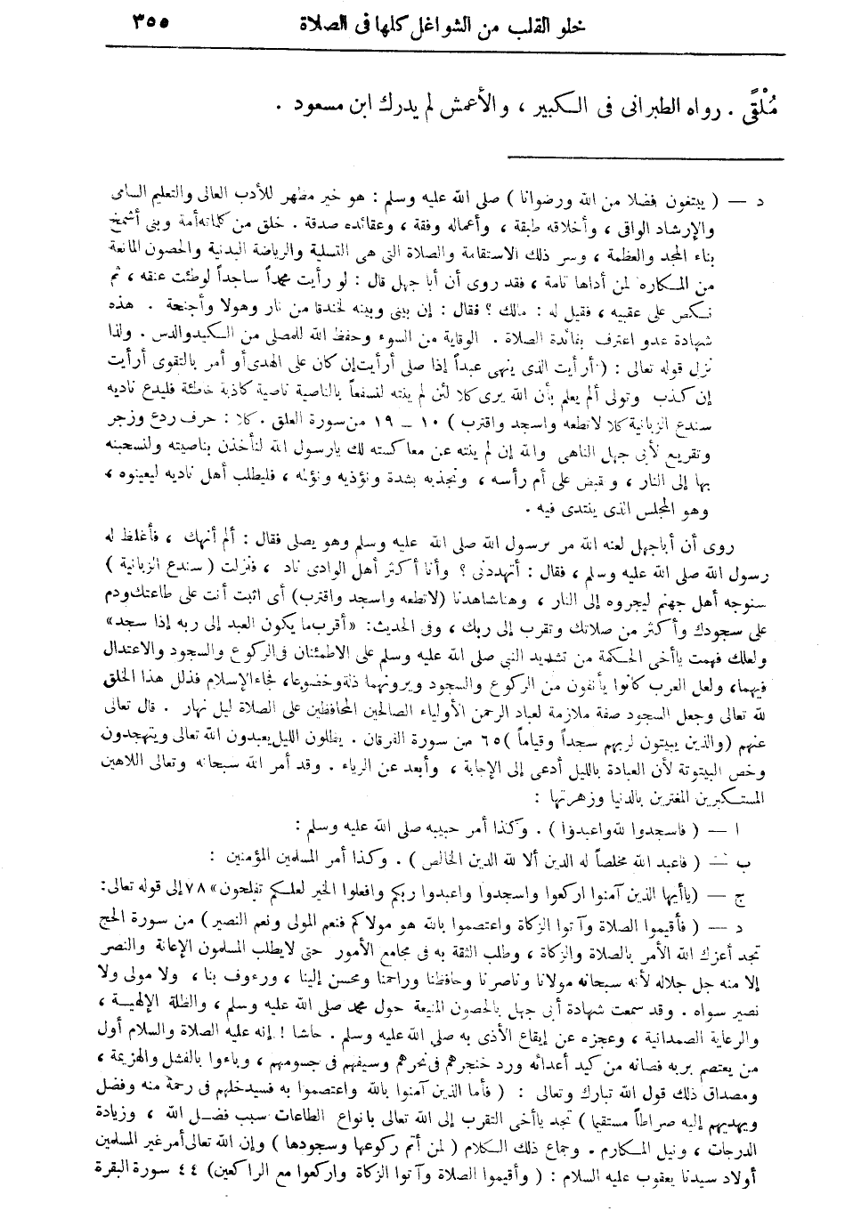د - (فأقيموا الصلاة وآتوا الزكاة واعتصموا بالله هو مولاكم فنعم المولى ونعم النصير) من سورة الحج تحد أعزك الله الأمر بالصلاة والزكاة، وطلب الثقة به في مجامع الأمور حتى لا يطلب المسلمون الإعانة والنصر إلا منه جل جلاله لأنه سبحانه مولانا وناصرنا وحافظنا وراحمنا ومحسن إلينا، ورءوف بنا، ولا مولى ولا نصير سواه. وقد سمعت شهادة أبى جهل بالحصون المنيعة حول محمد صلى الله عليه وسلم. حاشا! إنه عليه الصلاة والسلام أول من يعتصم بربه فصانه من كيد أعدائه ورد خنجرهم في نحرهم وسيفهم في جسومهم، وباءوا بالفشل والهزيمة، ومصداق ذلك قول الله تبارك وتعالى: (فأما الذين آمنوا بالله واعتصموا به فسيدخلهم في رحمة منه وفضل ويهديهم إليه صراطاً مستقيما) تجد يا أخى التقرب إلى الله تعالى بأنواع الطاعات سبب فضل الله، وزيادة الدرجات، وقيل المكارم، وجماع ذلك الكلام (لمن أتم ركوعها وسجودها) وإن الله تعالى أمر غير المسلمين أولاد سيدنا يعقوب عليه السلام: (وأقيموا الصلاة وآتوا الزكاة واركعوا مع الراكعين) 44 سورة البقرة. =