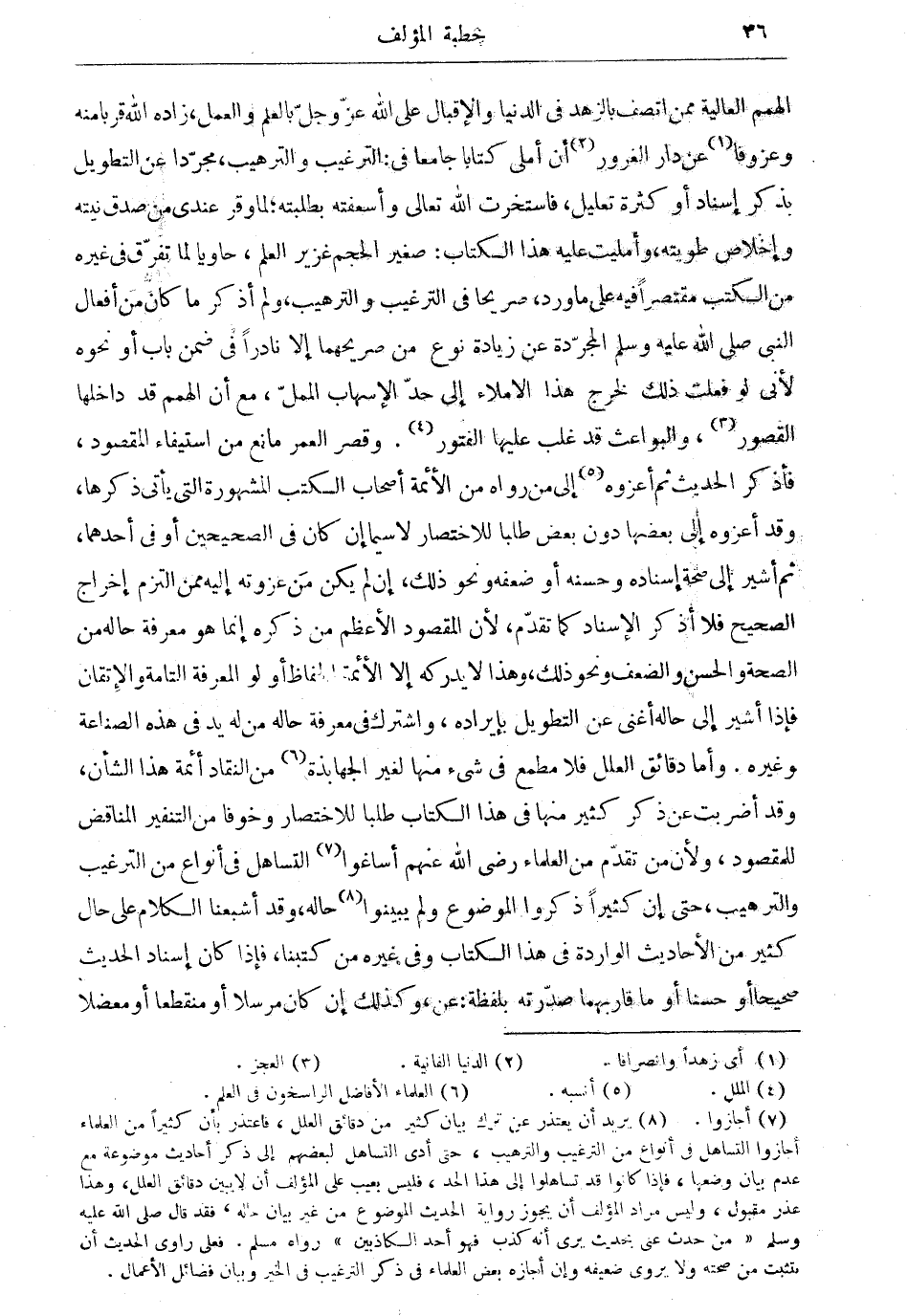 الهمم العالية ممن اتصف بالزهد في الدنيا والإقبال على الله عزّ وجلّ بالعلم والعمل، زاده الله قربا منه وعزوفا (¬1) عن دار الغرور (¬2) أن أملى كتابا جامعا في: الترغيب والترهيب، مجرّدا عن التطويل بذكر إسناد أو كثرة تعليل، فاستخرت الله تعالى وأسعفته بطلبته؛ لما وقر عندى من صدق نيته، وإخلاص طويته، وأمليت عليه هذا الكتاب: صغير الحجم غزير العلم، حاويا لما تفرّق في غيره من الكتب مقتصراً فيه على ما ورد، صريحا في الترغيب والترهيب، ولم أذكر ما كان أفعال النبي صلى الله عليه وسلم المجرّدة عن زيادة نوع من صريحهما إلا نادراً في ضمن باب أو نحوه لأنى لو فعلت ذلك لخرج هذا الاملاء إلى حدّ الإِسهاب المملّ، مع أن الهمم قد داخلها القصور (¬3)، والبواعث قد غلب عليها الفتور (¬4). وقصر العمر مانع من استيفاء المقصود، فأذكر الحديث ثم أعزوه، (¬5) إلى من وراء من الأئمة أصحاب الكتب المشهورة التي يأتى ذكرها، وقد أعزوه إلى بعضها دون بعض طلبا للاختصار لا سيمان إن كان في الصحيحين أو في أحدهما، ثم أشير إلى صحة إسناده كما تقدّم، لأن المقصود الأعظم من ذكره إنما هو معرفة حاله من الصحة والحسن والضعف ونحو ذلك، وهذا لا يدركه إلا الأئمة الحفاظ أولو المعرفة التامة والإتقان فإذا أشير إلى حاله أغنى عن التطويل بإيراده، واشترك في معرفة حاله من له يد في هذه الصناعة وغيره. وأما دقائق العلل فلا مطمع في شيء منها لغير الجهابذة (¬6) من النقاد أئمة هذا الشأن، وقد أضربت عن ذكر من تقدّم من العلماء رضي الله عنهم أساغوا (¬7)