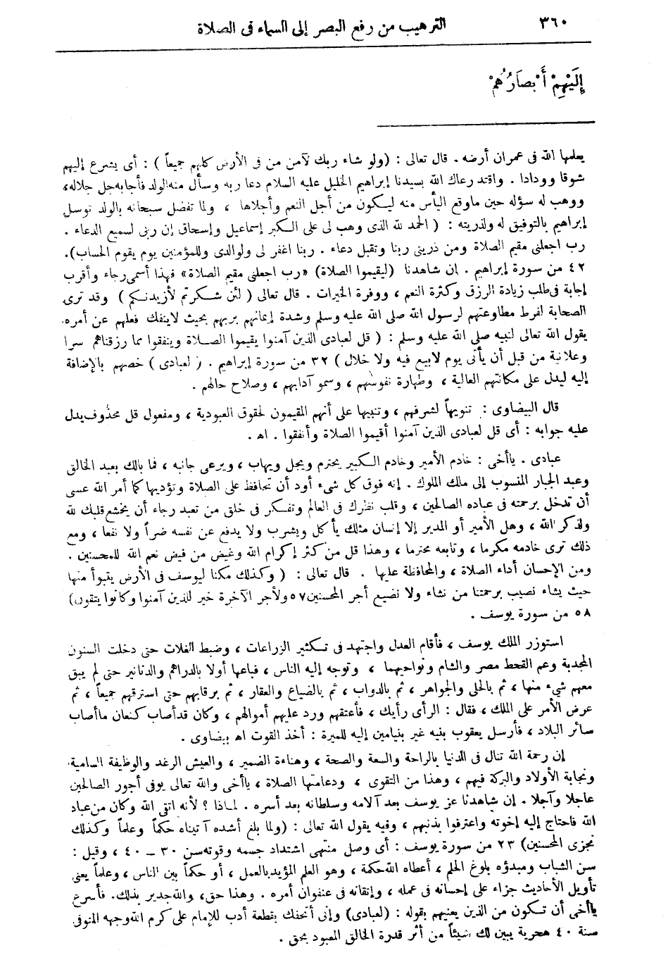 = يعلمها الله في عمران أرضه. قال تعالى: (ولو شاء ربك لآمن من في الأرض كلهم جميعاً): أي يشرع إليهم شوقا وودادا. وَاقْتَدِ رعاك الله بسيدنا إبراهيم الخليل عليه السلام دعا ربه وسأل منه الولد فأجابه جل جلاله، ووهب له سؤله حين ما وقع اليأس منه ليكون من أجل النعم وأجلاها. ولما تفضل سبحانه بالولد توسل إبراهيم بالتوفيق له ولذريته: (الحمد لله الذى وهب لي على الكبر إسماعيل وإسحاق إن ربى لسميع الدعاء. رب اجعلنى مقيم الصلاة ومن ذريتي ربنا وتقبل دعاء. ربنا اغفر لى ولوالدى وللمؤمنين يوم يقوم الحساب). 42 من سورة إبراهيم. إن شاهدنا (ليقيموا الصلاة) (رب اجعلنى مقيم الصلاة) فهذا أسمى رجاء واقرب إجابة في طلب زيادة الرزق وكثرة النعم، ووفرة الخيرات. قال تعالى (لئن شكرتم لأزيدنكم) وقد ترى الصحابة لفرط مطاوعتهم لرسول الله صلى الله عليه وسلم وشدة إيمانهم بربهم بحيث لا ينفك فعلهم عن أمره يقول الله تعالى لنبيه صلى الله عليه وسلم: (قل لعبادي الذين آمنوا يقيموا الصلاة وينفقوا مما رزقناهم سرا وعلانية من قبل أن يأتى يوم لا بيع فيه ولا خلال) 32 من سورة إبراهيم. (لعبادى) خصهم بالإضافة إليه ليدل علىمكانتهم العالية، وطهارة نفوسهم، وسموا آدابهم، وصلاح حالهم.