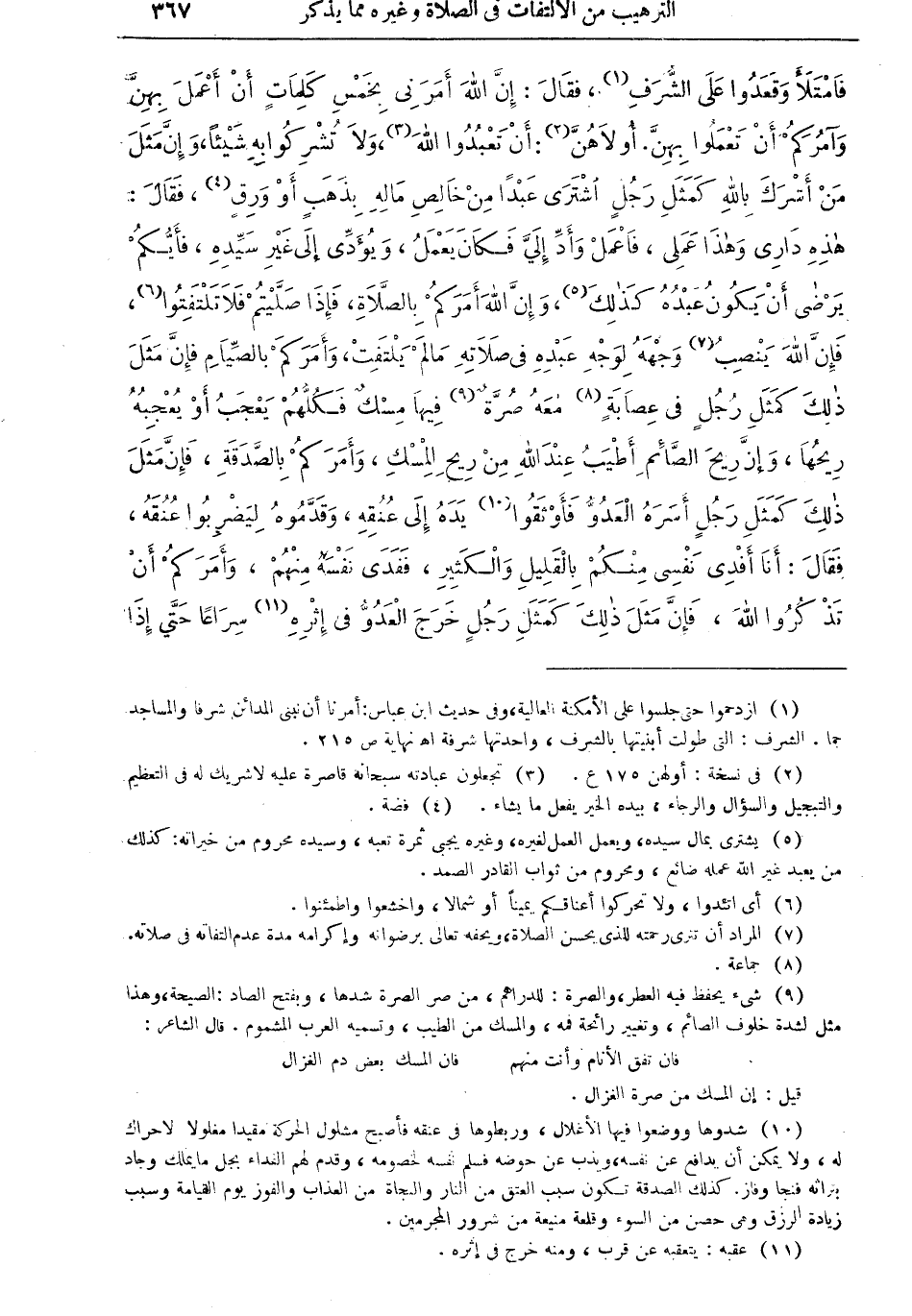 أن تعبدوا الله (¬3) ولا تشرِكُوا به شيئاً، وإن مثل من أشرك بالله كمثل رجل اشترى عبداً من خالص ماله بذهبٍ أو ورقٍ (¬4)، فقال: هذه دارى وهذا عملى، فاعمل وأد إلىَّ فكان يعمل، ويؤدى إلى غيره سيده، فأيُّكم يرضى أن يكون عبده كذلك (¬5)، وإن الله أمركم بالصلاة، فإذا صليتم فلا تلتفتوا (¬6)، فإن الله ينصب (¬7) وجهه لوجه عبده في صلاته ما لم يلتفت، وأمركم بالصيام فإن مثل ذلك كمثل رجلٍ في عصابةٍ (¬8) معه صُرةٌ (¬9)