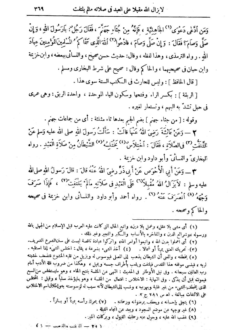 2 - وعن عائشة رضي الله عنها قالت: سألت رسول الله صلى الله عليه وسلم عن التَّلَفُّتِ (¬3) في الصلاة، فقال: اختلاسٌ (¬4) يختلسه (¬5) الشيطان من صلاة العبد. رواه البخاري والنسائي وأبو داود وابن خزيمة.