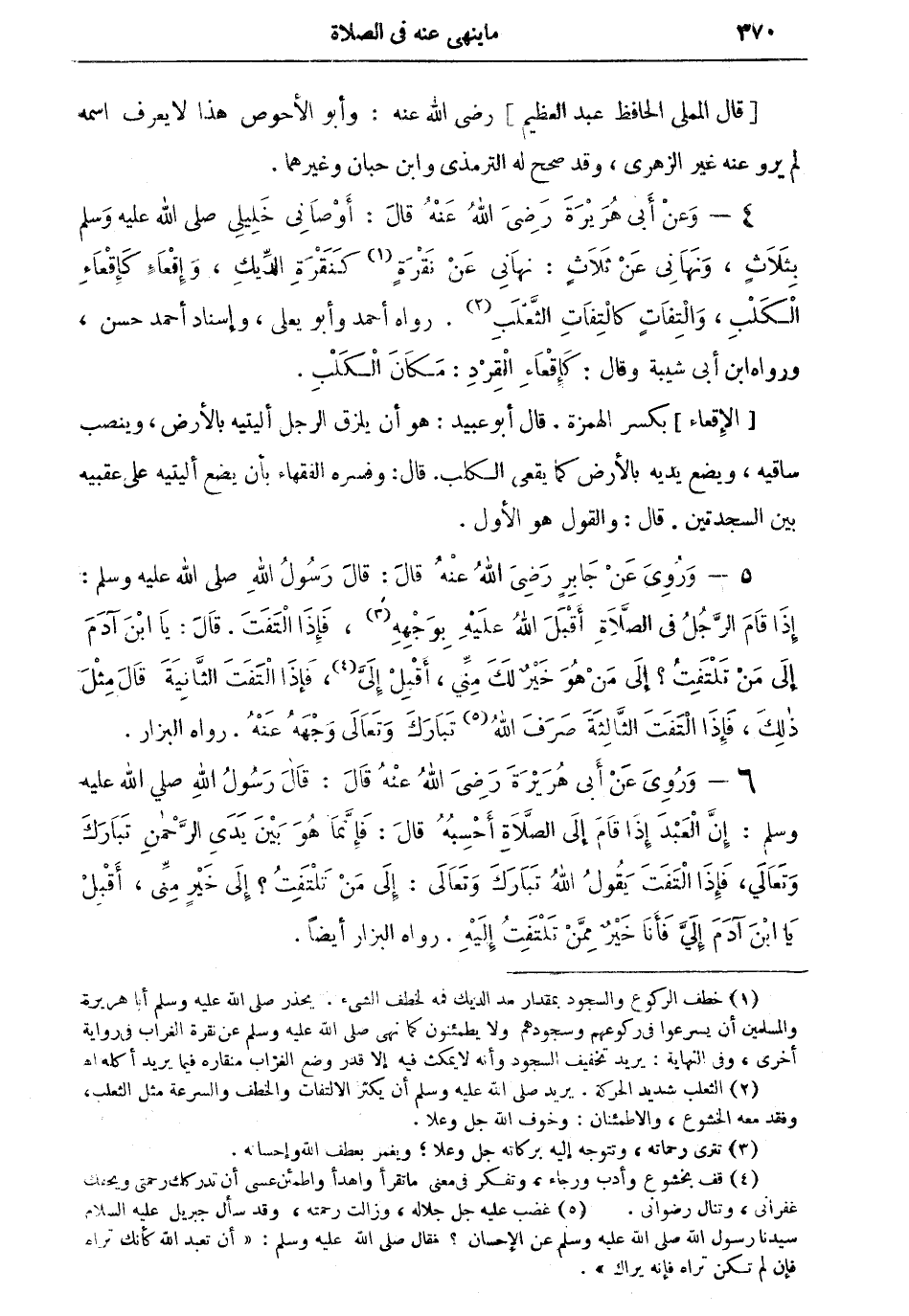 4 - وعن أبي هريرة رضي الله عنه قال: أوصانى خليلى صلى الله عليه وسلم بثلاثٍ، ونهانى عن ثلاثٍ: نهانى عن نقرةٍ (¬1) كنقرة الديك، وإقعاء كإقعاء الكلب، والتفاتٍ كالتفاتِ الثعلب (¬2). رواه أحمد وأبو يعلى، وإسناد أحمد حسن، ورواه ابن أبى شيبة وقال: كإقعاء القرد: مكان الكلب.