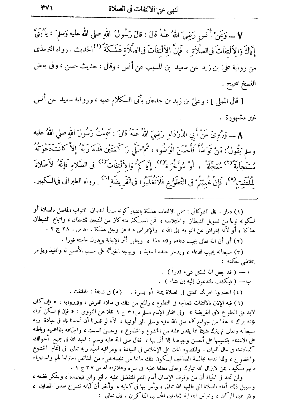7 - وعن أنس رضي الله عنه قال: قال رسول الله صلى الله عليه وسلم: يابُنى إياك والالتفات في الصلاة، فإن الالتفات في الصلاة هلكة (¬1) الحديث. رواه الترمذي من رواية علىّ بن زيد عن سعيد بن المسيب عن أنس، وقال: حديث حسن، وفى بعض النسخ صحيح.