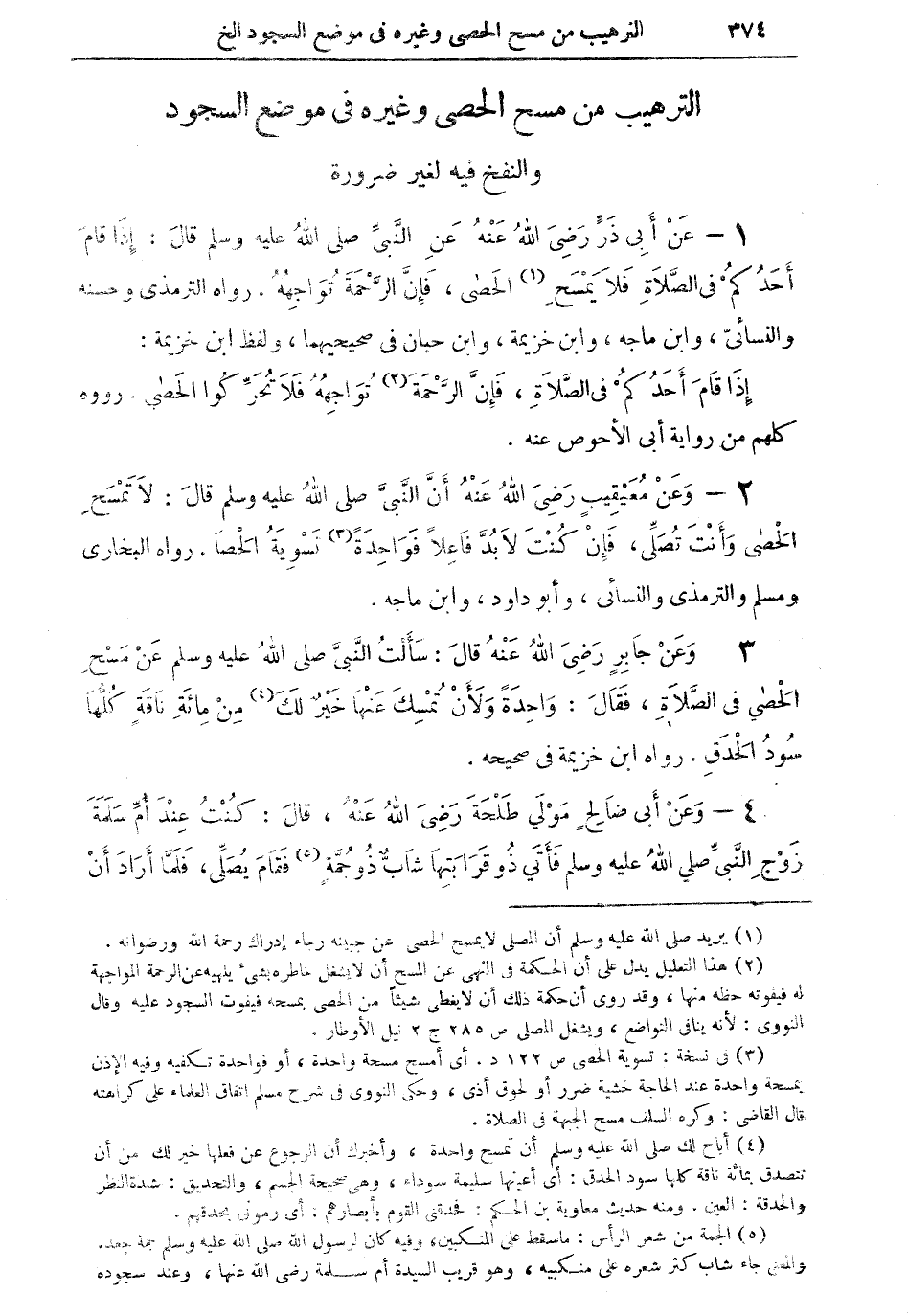2 - وعن مُعيقيبٍ رضي الله عنه أن النبى صلى الله عليه وسلم قال: لا تمسح الحصى وأنت تصلى، فإن كنت لابد فاعلا فواحدةً (¬3) تسوية الحصا. رواه البخاري ومسلم والترمذي والنسائي، وأبو داود، وابن ماجه.