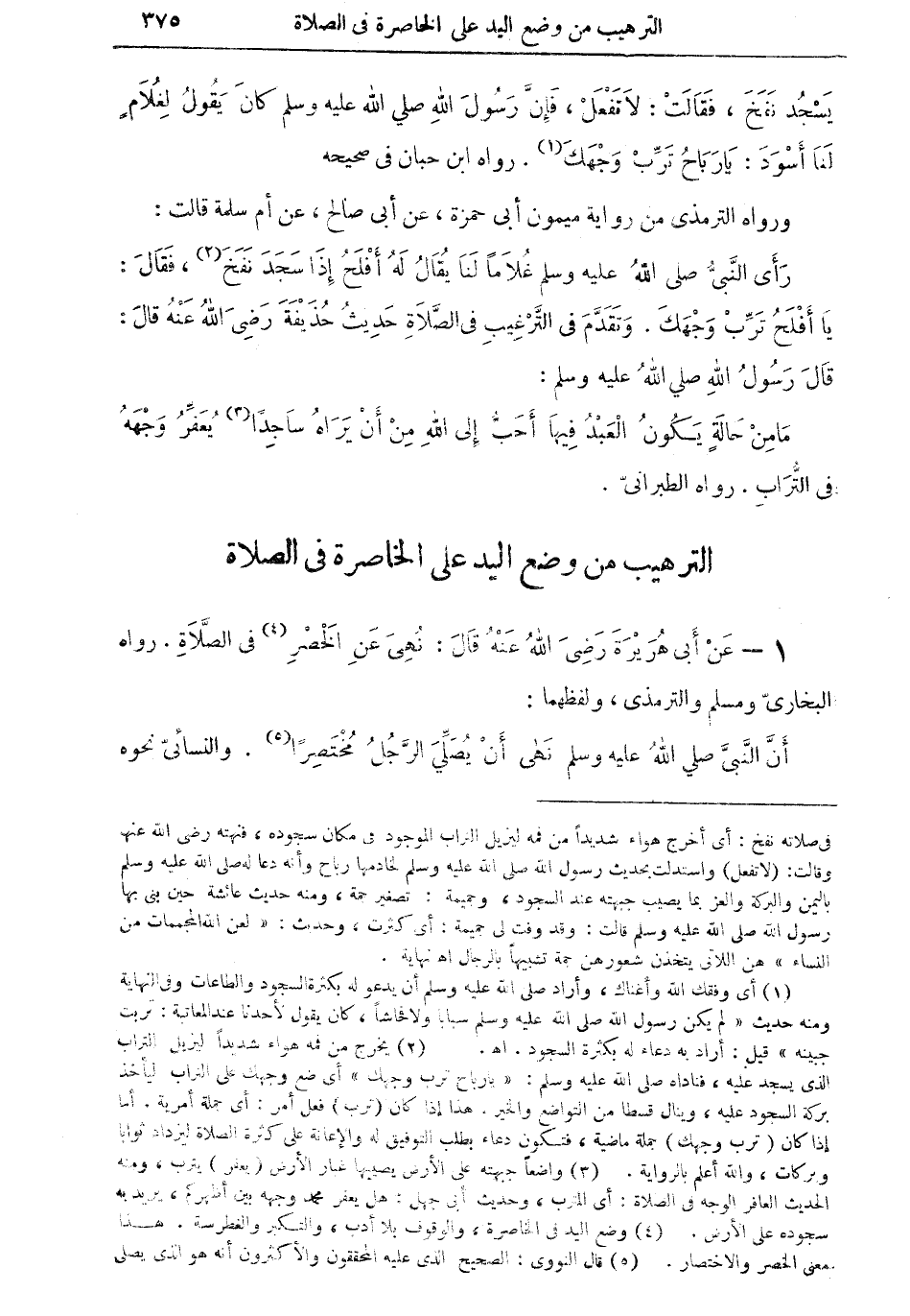 1 - عن أبي هريرة رضي الله عنه قال: نُهى عن الخصر (¬4) في الصلاة. رواه البخاريّ ومسلم والترمذي، ولفظهما: